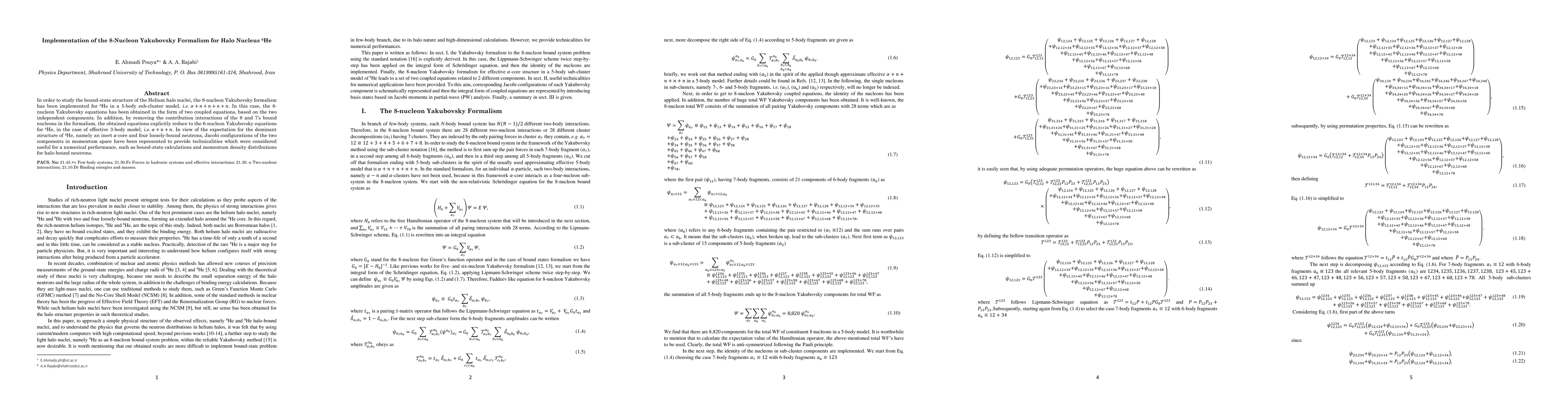 In order to study the bound-state structure of the Helium halo nuclei, the 8-nucleon Yakubovsky formalism has been implemented for 8He in a 5-body sub-cluster model, i.e. alpha+n+n+n+n. In this case, the 8-nucleon Yakubovsky equations has been obtained in the form of two coupled equations, based on the two independent components. In addition, by removing the contribution interactions of the 8 and 7s bound nucleons in the formalism, the obtained equations explicitly reduce to the 6-nucleon Yakubovsky equations for 6He, in the case of effective 3-body model, i.e. alpha+n+n. In view of the expectation for the dominant structure of 8He, namely an inert alpha-core and four loosely-bound neutrons, Jacobi configurations of the two components in momentum space have been represented to provide technicalities which were considered useful for a numerical performance, such as bound-state calculations and momentum density distributions for halo-bound neutrons.