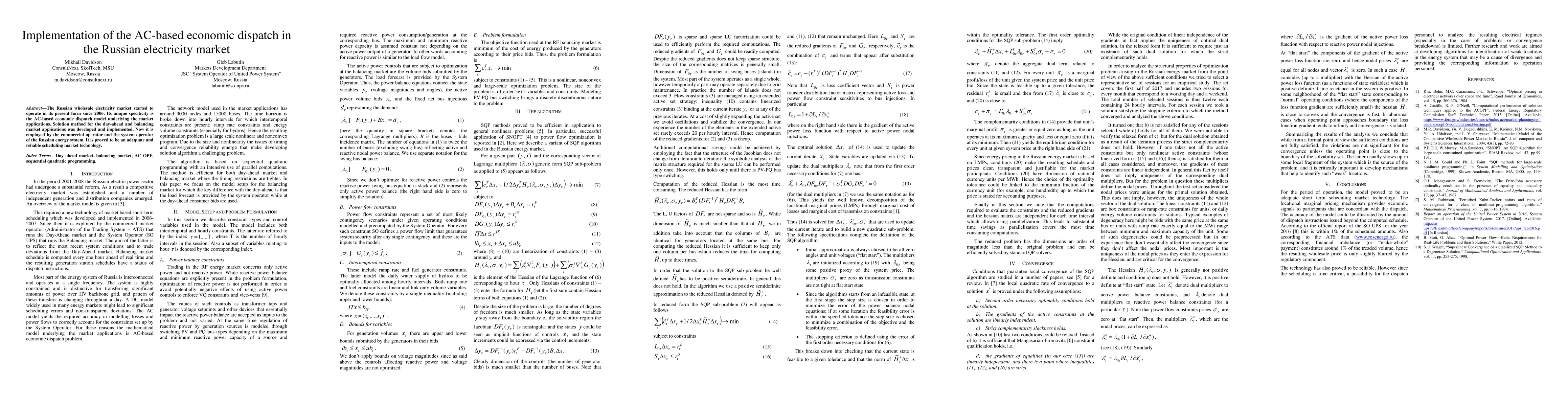 The paper discusses the implementation of an AC-based economic dispatch model in the Russian electricity market, which began operating in 2006. The developed solution method for day-ahead and balancing markets has proven to be reliable and is now used by commercial and system operators.