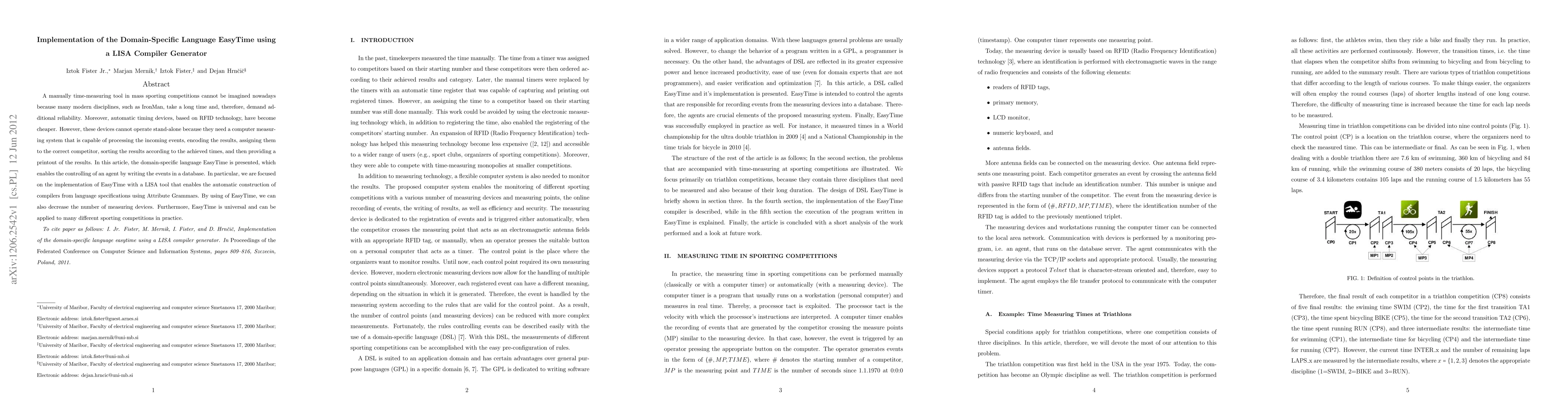 A manually time-measuring tool in mass sporting competitions cannot be imagined nowadays because many modern disciplines, such as IronMan, take a long time and, therefore, demand additional reliability. Moreover, automatic timing devices, based on RFID technology, have become cheaper. However, these devices cannot operate stand-alone because they need a computer measuring system that is capable of processing the incoming events, encoding the results, assigning them to the correct competitor, sorting the results according to the achieved times, and then providing a printout of the results. In this article, the domain-specific language EasyTime is presented, which enables the controlling of an agent by writing the events in a database. In particular, we are focused on the implementation of EasyTime with a LISA tool that enables the automatic construction of compilers from language specifications using Attribute Grammars. By using of EasyTime, we can also decrease the number of measuring devices. Furthermore, EasyTime is universal and can be applied to many different sporting competitions in practice.