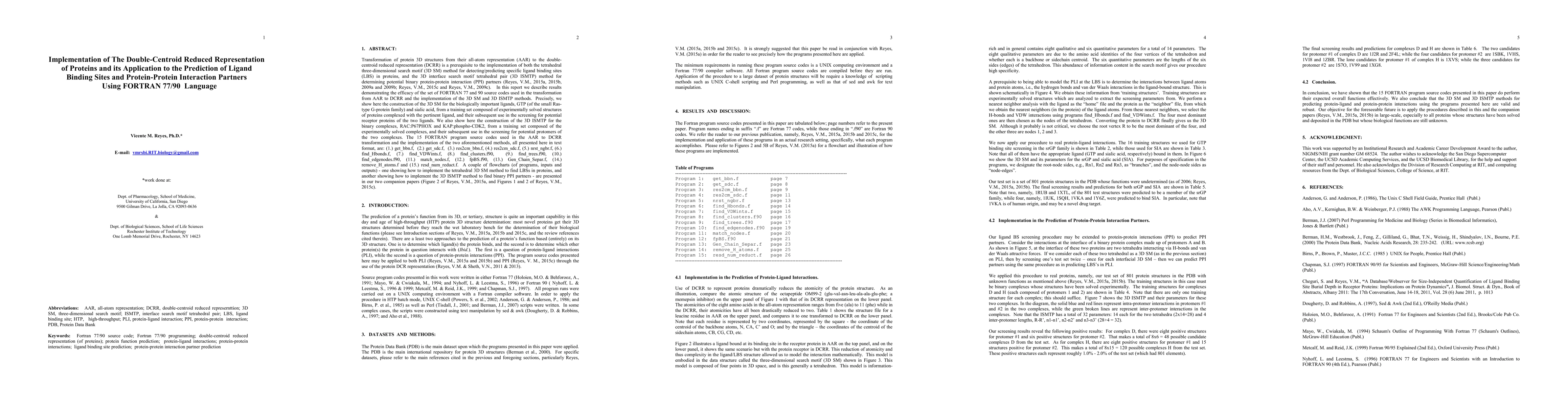 Transformation of protein 3D structures from their all-atom representation (AAR) to the double-centroid reduced representation (DCRR) is a prerequisite to the implementation of both the tetrahedral three-dimensional search motif (3D SM) method for predicting specific ligand binding sites (LBS) in proteins, and the 3D interface search motif tetrahedral pair (3D ISMTP) method for predicting binary protein-protein interaction (PPI) partners (Reyes, V.M., 2015a & c, 2015b, 2009a, b & c). Here we describe results demonstrating the efficacy of the set of FORTRAN 77 and 90 source codes used in the transformation from AAR to DCRR and the implementation of the 3D SM and 3D ISMTP methods. Precisely, we show here the construction of the 3D SM for the biologically important ligands, GTP and sialic acid, from a training set composed of experimentally solved structures of proteins complexed with the pertinent ligand, and their subsequent use in the screening for potential receptor proteins of the two ligands. We also show here the construction of the 3D ISMTP for the binary complexes, RAC:P67PHOX and KAP:phospho-CDK2, from a training set composed of the experimentally solved complexes, and their subsequent use in the screening for potential protomers of the two complexes. The 15 FORTRAN programs used in the AAR to DCRR transformation and the implementation of the two said methods are: get_bbn.f, get_sdc.f, res2cm_bbn.f, res2cm_sdc.f, nrst_ngbr.f, find_Hbonds.f, find_VDWints.f, find_clusters.f90, find_trees.f90, find_edgenodes.f90, match_nodes.f, fpBS.f90, Gen_Chain_Separ.f, remove_H_atoms.f and resd_num_reduct.f. Two flowcharts - one showing how to implement the tetrahedral 3D SM method to find LBSs in proteins, and another how to implement the 3D ISMTP method to find binary PPI partners - are presented in our two companion papers (Fig. 2, Reyes, V.M., 2015a, Fig. 1 & 2, Reyes, V.M., 2015c).