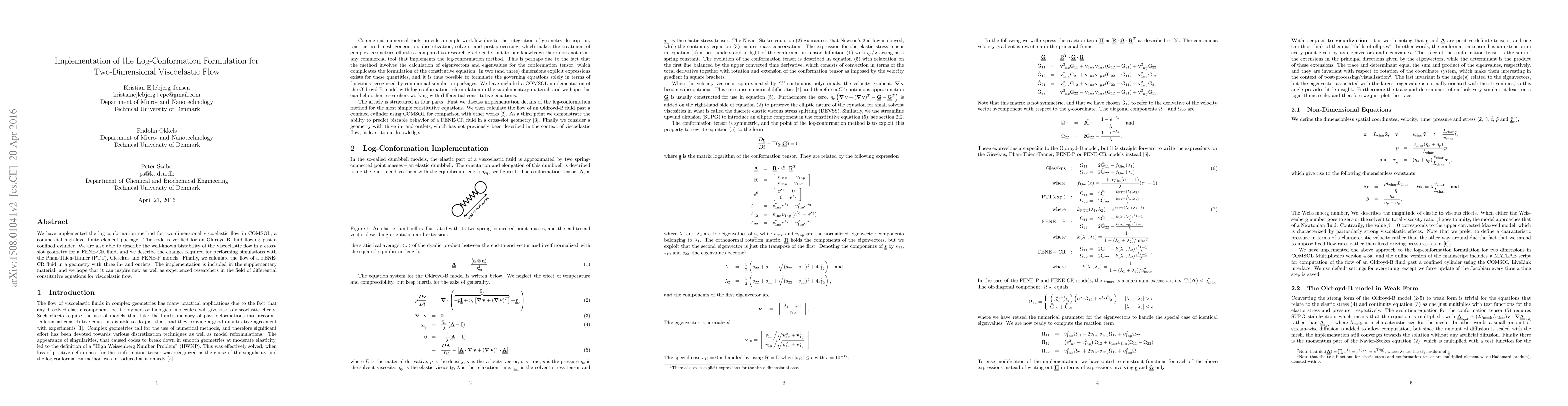 This paper implements the log-conformation method for simulating two-dimensional viscoelastic flow using COMSOL, verifying the model with an Oldroyd-B fluid past a cylinder and demonstrating its application to FENE-CR, PTT, Giesekus, and FENE-P models in various geometries. The supplementary material includes the implementation code.