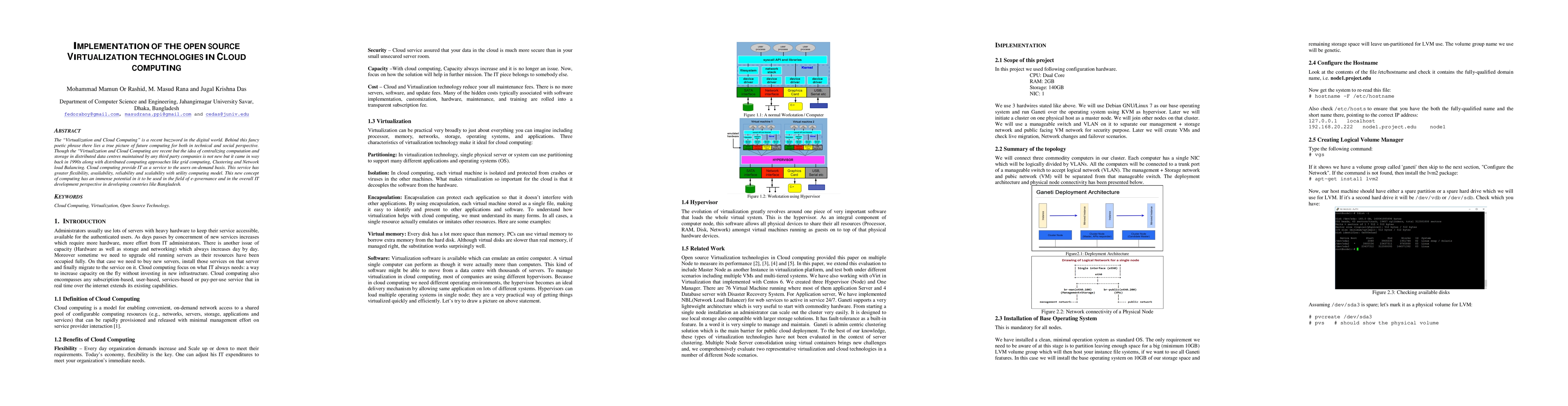 The Virtualization and Cloud Computing is a recent buzzword in the digital world. Cloud computing provide IT as a service to the users on demand basis. This service has greater flexibility, availability, reliability and scalability with utility computing model. This new concept of computing has an immense potential in it to be used in the field of e-governance and in the overall IT development perspective in developing countries like Bangladesh.