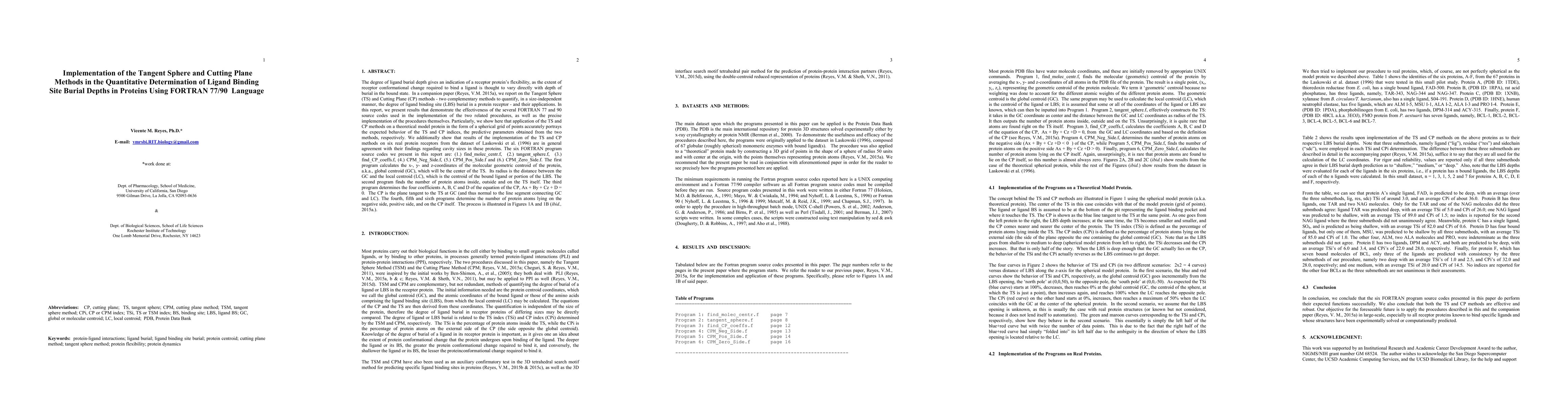 Ligand burial depth is an indicator of protein flexibility, as the extent of receptor conformational change required to bind a ligand in general varies directly with its depth of burial. In a companion paper (Reyes, V.M. 2015a), we report on the Tangent Sphere (TS) and Cutting Plane (CP) methods -- complementary methods to quantify, independent of protein size, the degree of ligand burial in a protein receptor. In this report, we present results that demonstrate the effectiveness of a set of FORTRAN 77 and 90 source codes used in the implementation of the two related procedures, as well as the precise implementation of the procedures. Particularly, we show here that application of the TS and CP methods on a theoretical model protein in the form of a spherical grid of points accurately portrays the behavior of the TS and CP indices, the predictive parameters obtained from the two methods. We also show that results of the implementation of the TS and CP methods on six protein receptors (Laskowski et al. 1996) are inagreement with their findings regarding cavity sizes in these proteins. The six FORTRAN programs we present here are: find_molec_centr.f, tangent_sphere.f, find_CP_coeffs.f, CPM_Neg_Side.f, CPM_Pos_Side.f and CPM_Zero_Side.f. The first program calculates the x-, y- and z-coordinates of the molecular geometric centroid of the protein (global centroid, GC), the center of the TS. Its radius is the distance between the GC and the local centroid (LC), the centroid of the bound ligand or a portion of its binding site. The second program finds the number of protein atoms inside, outside and on the TS. The third determines the four coefficients A, B, C and D of the equation of the CP, Ax + By + Cz + D = 0. The CP is tangent to the TS at GC. The fourth, fifth and sixth programs determine the number of protein atoms lying on the negative side, positive side, and on the CP.