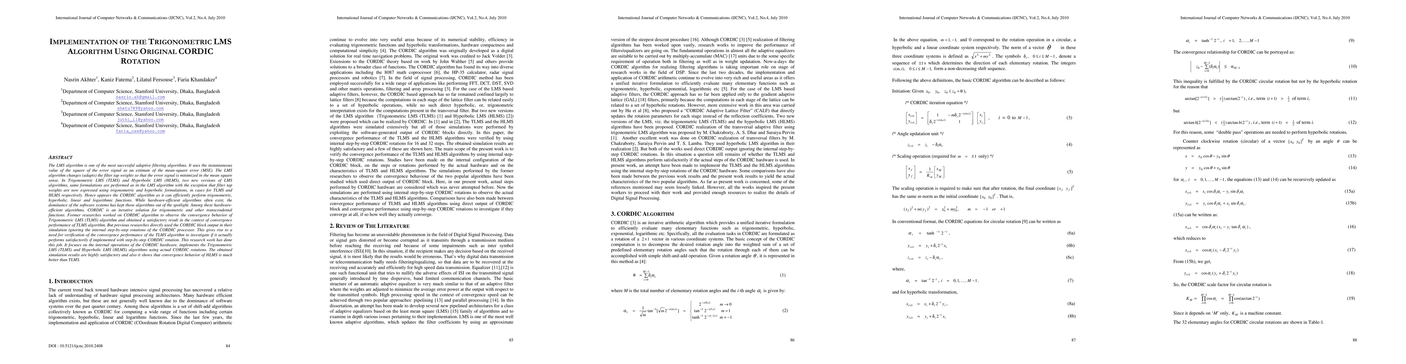 The research focuses on implementing Trigonometric LMS (TLMS) and Hyperbolic LMS (HLMS) algorithms using actual CORDIC rotations, investigating the convergence performance and comparing TLMS with HLMS.