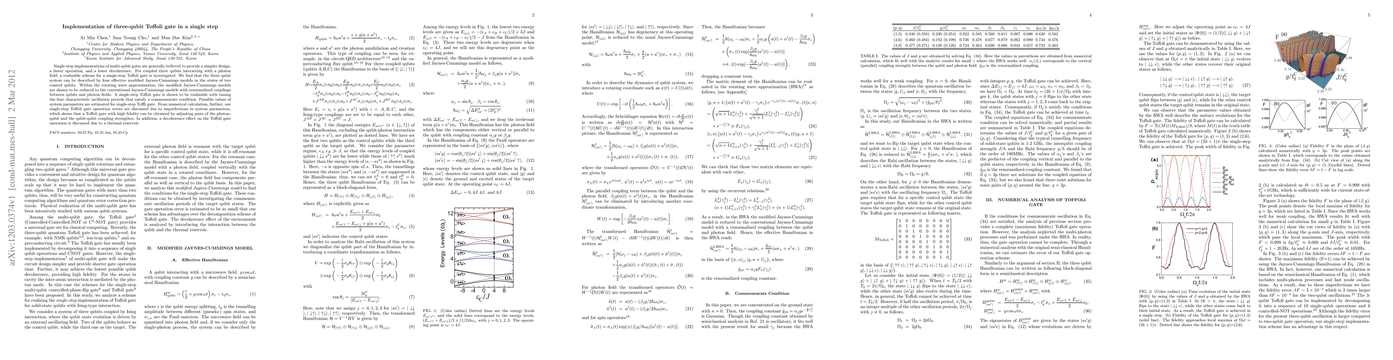 This paper investigates a single-step implementation of a three-qubit Toffoli gate using coupled qubits interacting with a photon field, showing that it can be realized through four effective modified Jaynes-Cummings models. The study discusses operation errors and decoherence effects, suggesting high fidelity can be achieved by adjusting system parameters.