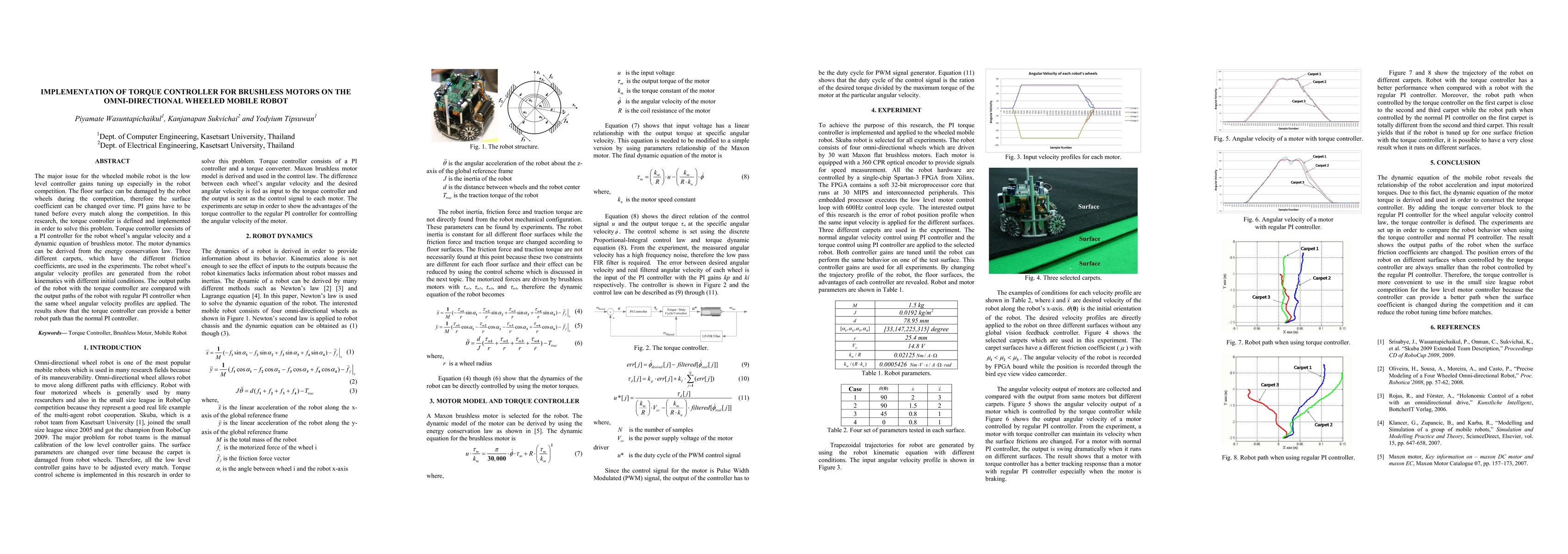 The major issue for the wheeled mobile robot is the low level controller gains tuning up especially in the robot competition. The floor surface can be damaged by the robot wheels during the competition, therefore the surface coefficient can be changed over time. PI gains have to be tuned before every match along the competition. In this research, the torque controller is defined and implemented in order to solve this problem. Torque controller consists of a PI controller for the robot wheel's angular velocity and a dynamic equation of brushless motor. The motor dynamics can be derived from the energy conservation law. Three different carpets, which have the different friction coefficients, are used in the experiments. The robot wheel's angular velocity profiles are generated from the robot kinematics with different initial conditions. The output paths of the robot with the torque controller are compared with the output paths of the robot with regular PI controller when the same wheel angular velocity profiles are applied. The results show that the torque controller can provide a better robot path than the normal PI controller.