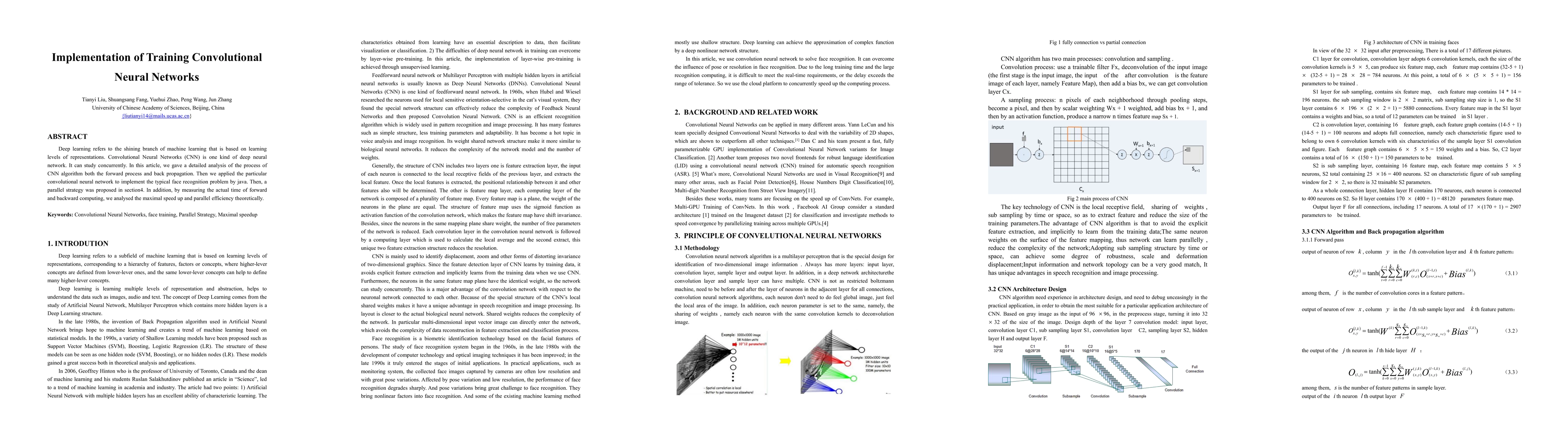Deep learning refers to the shining branch of machine learning that is based on learning levels of representations. Convolutional Neural Networks (CNN) is one kind of deep neural network. It can study concurrently. In this article, we gave a detailed analysis of the process of CNN algorithm both the forward process and back propagation. Then we applied the particular convolutional neural network to implement the typical face recognition problem by java. Then, a parallel strategy was proposed in section4. In addition, by measuring the actual time of forward and backward computing, we analysed the maximal speed up and parallel efficiency theoretically.