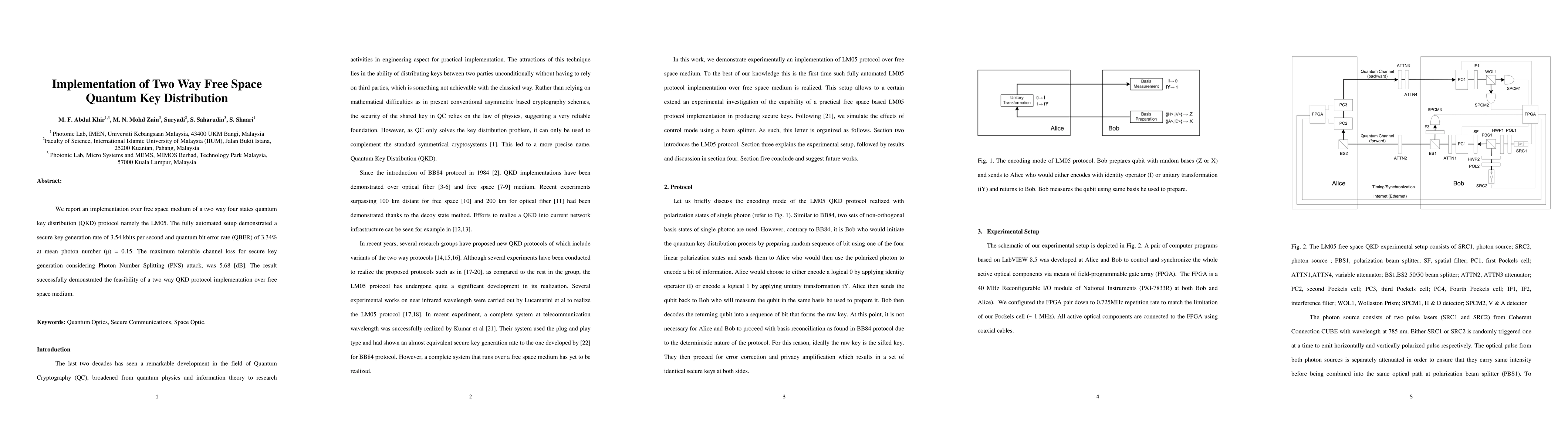 This paper presents a fully automated two-way free space quantum key distribution (QKD) using the LM05 protocol, achieving a secure key generation rate of 3.54 kbits per second and a QBER of 3.34% under a mean photon number of 0.15, with a maximum tolerable channel loss of 5.68 dB.