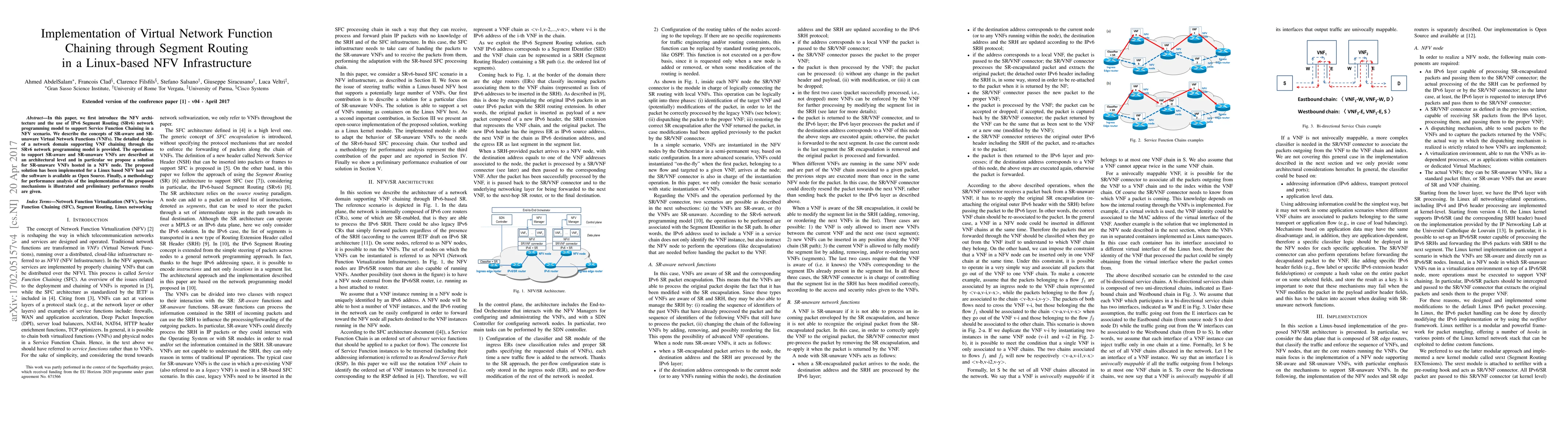 This paper introduces a Linux-based NFV architecture utilizing IPv6 Segment Routing (SRv6) to implement Service Function Chaining. It proposes a solution for SR-unaware VNFs and provides preliminary performance results, with the implementation available as Open Source.