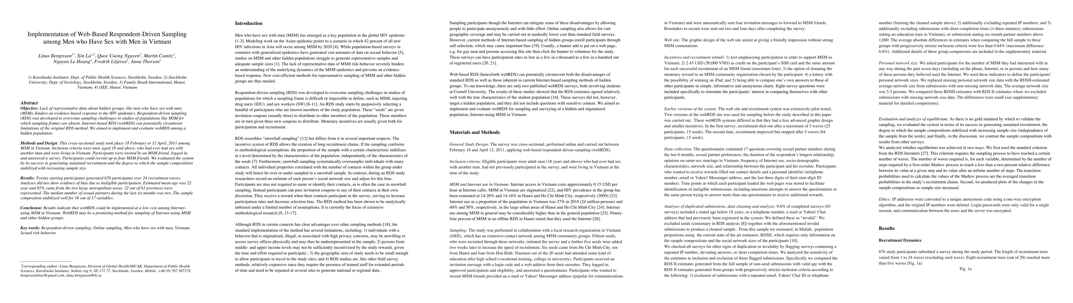 This study implemented web-based respondent-driven sampling (webRDS) among men who have sex with men (MSM) in Vietnam to obtain representative data for HIV-related research. The method successfully recruited 676 MSM over 24 waves, showing low bias and stabilized sample composition, indicating webRDS as a cost-effective tool for sampling hidden populations.