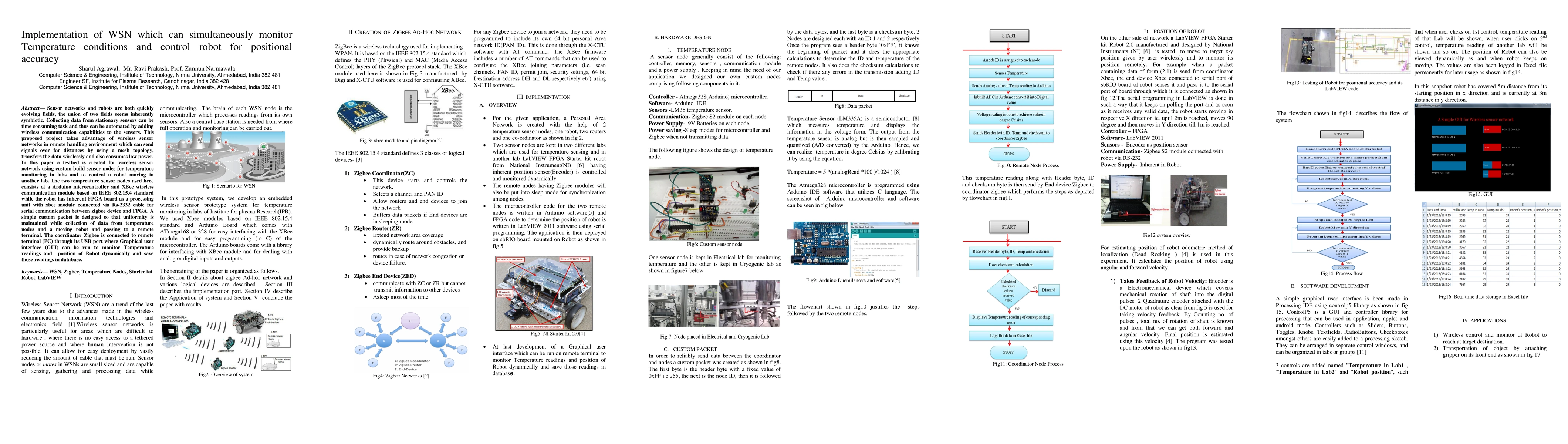 Sensor networks and robots are both quickly evolving fields, the union of two fields seems inherently symbiotic. Collecting data from stationary sensors can be time consuming task and thus can be automated by adding wireless communication capabilities to the sensors. This proposed project takes advantage of wireless sensor networks in remote handling environment which can send signals over far distances by using a mesh topology, transfers the data wirelessly and also consumes low power. In this paper a testbed is created for wireless sensor network using custom build sensor nodes for temperature monitoring in labs and to control a robot moving in another lab. The two temperature sensor nodes used here consists of a Arduino microcontroller and XBee wireless communication module based on IEEE 802.15.4 standard while the robot has inherent FPGA board as a processing unit with xbee module connected via Rs-2332 cable for serial communication between zigbee device and FPGA. A simple custom packet is designed so that uniformity is maintained while collection of data from temperature nodes and a moving robot and passing to a remote terminal. The coordinator Zigbee is connected to remote terminal (PC) through its USB port where Graphical user interface (GUI) can be run to monitor Temperature readings and position of Robot dynamically and save those readings in database.