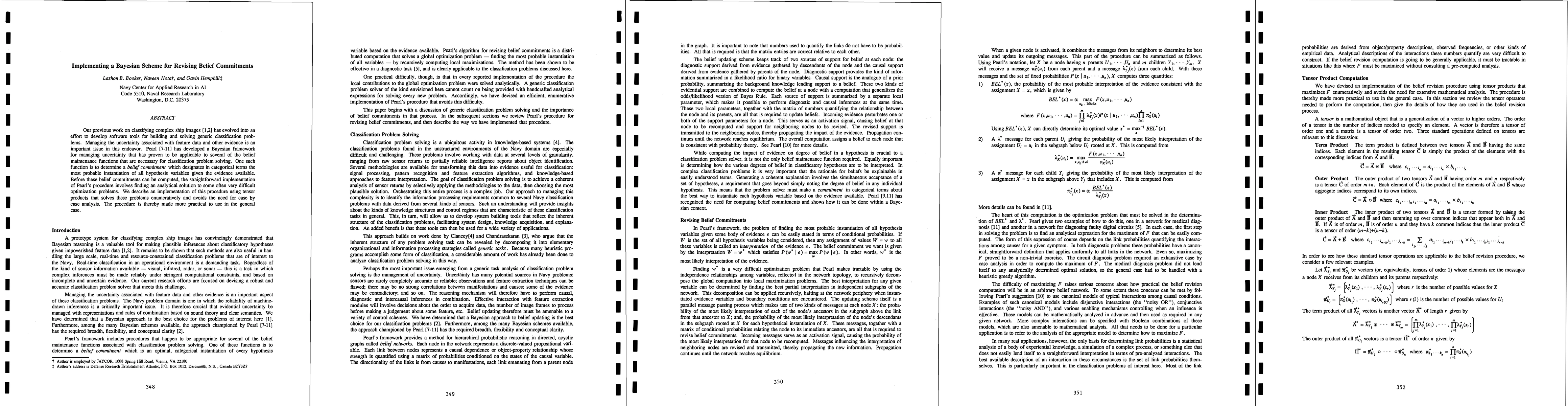 Our previous work on classifying complex ship images [1,2] has evolved into an effort to develop software tools for building and solving generic classification problems. Managing the uncertainty associated with feature data and other evidence is an important issue in this endeavor. Bayesian techniques for managing uncertainty [7,12,13] have proven to be useful for managing several of the belief maintenance requirements of classification problem solving. One such requirement is the need to give qualitative explanations of what is believed. Pearl [11] addresses this need by computing what he calls a belief commitment-the most probable instantiation of all hypothesis variables given the evidence available. Before belief commitments can be computed, the straightforward implementation of Pearl's procedure involves finding an analytical solution to some often difficult optimization problems. We describe an efficient implementation of this procedure using tensor products that solves these problems enumeratively and avoids the need for case by case analysis. The procedure is thereby made more practical to use in the general case.