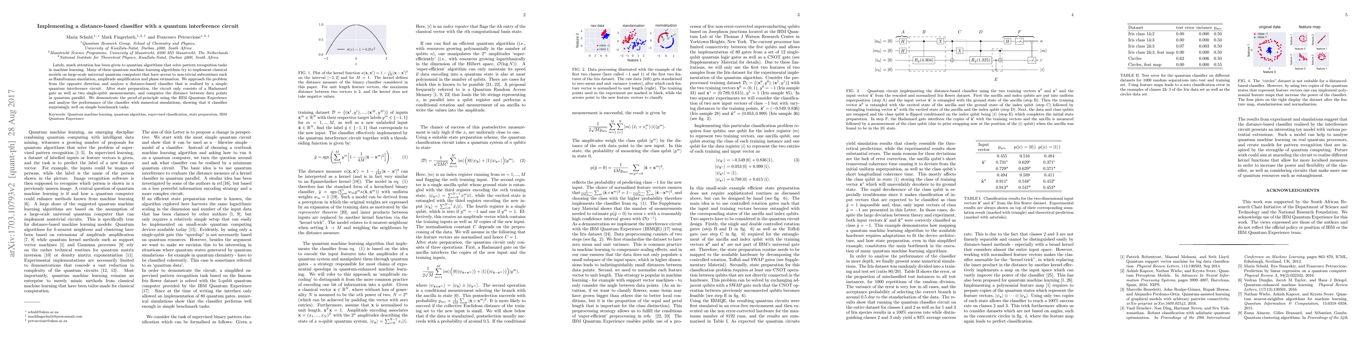 Lately, much attention has been given to quantum algorithms that solve pattern recognition tasks in machine learning. Many of these quantum machine learning algorithms try to implement classical models on large-scale universal quantum computers that have access to non-trivial subroutines such as Hamiltonian simulation, amplitude amplification and phase estimation. We approach the problem from the opposite direction and analyse a distance-based classifier that is realised by a simple quantum interference circuit. After state preparation, the circuit only consists of a Hadamard gate as well as two single-qubit measurements, and computes the distance between data points in quantum parallel. We demonstrate the proof-of-principle using the IBM Quantum Experience and analyse the performance of the classifier with numerical simulations, showing that it classifies surprisingly well for simple benchmark tasks.