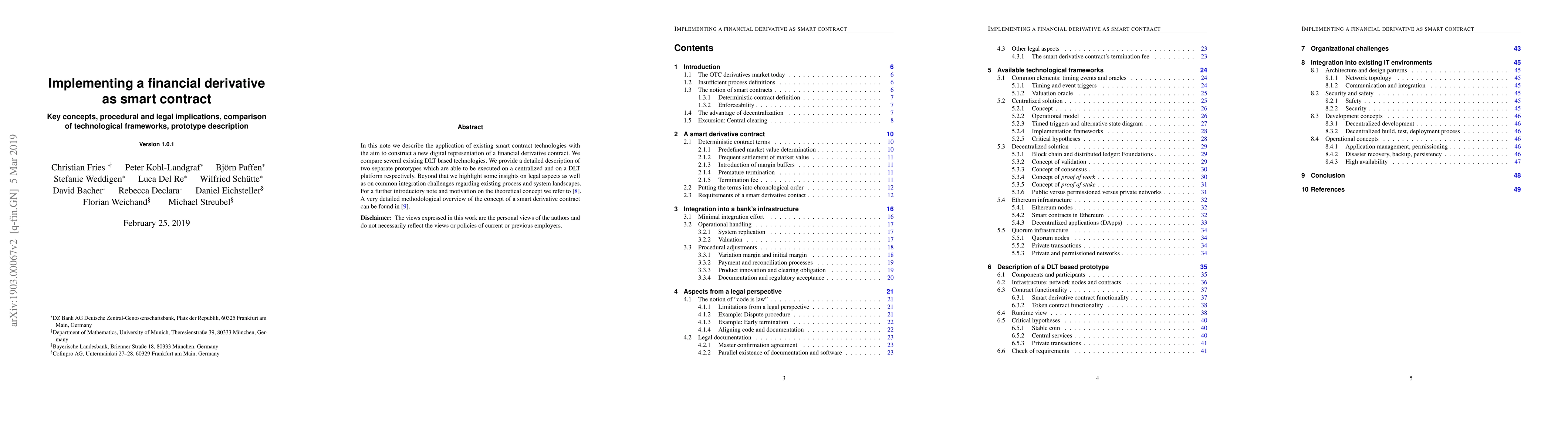 This paper explores the use of smart contract technologies to create a digital representation of financial derivative contracts, comparing various distributed ledger technologies (DLT). It presents two prototypes for executing these contracts on centralized and DLT platforms, and discusses legal implications and integration challenges. For further theoretical background, refer to the linked OxBLB post and the detailed methodological overview in the provided SSRN link.