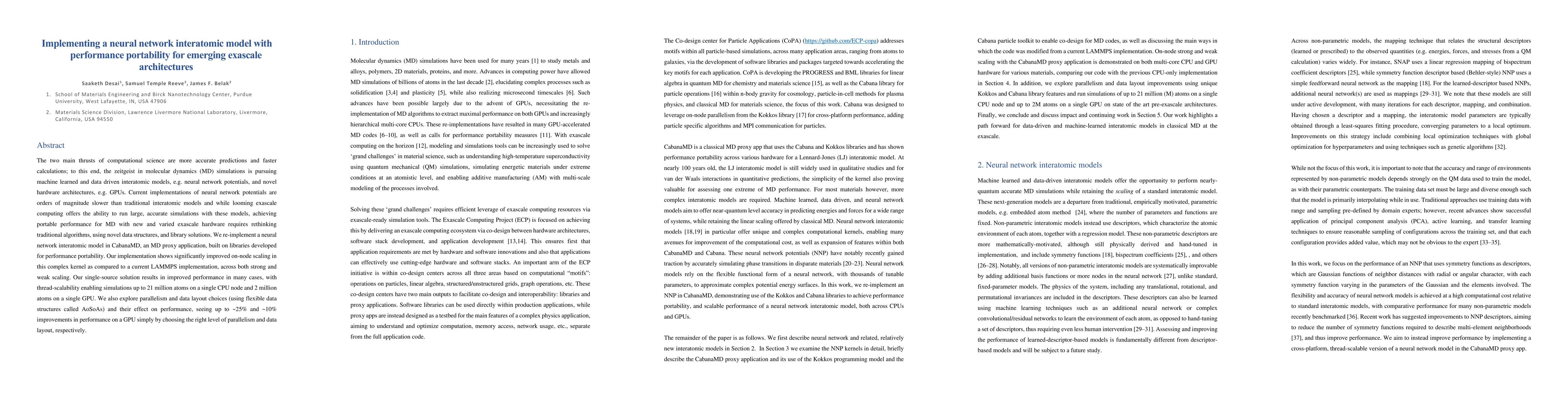 This paper presents an optimized neural network interatomic model for molecular dynamics simulations, implemented in CabanaMD to achieve performance portability across exascale architectures. The new implementation shows significant improvements in scaling and performance, enabling simulations of up to 21 million atoms on a single CPU node and 2 million atoms on a single GPU, with up to 25% performance gains on GPUs through optimal parallelism and data layout strategies.