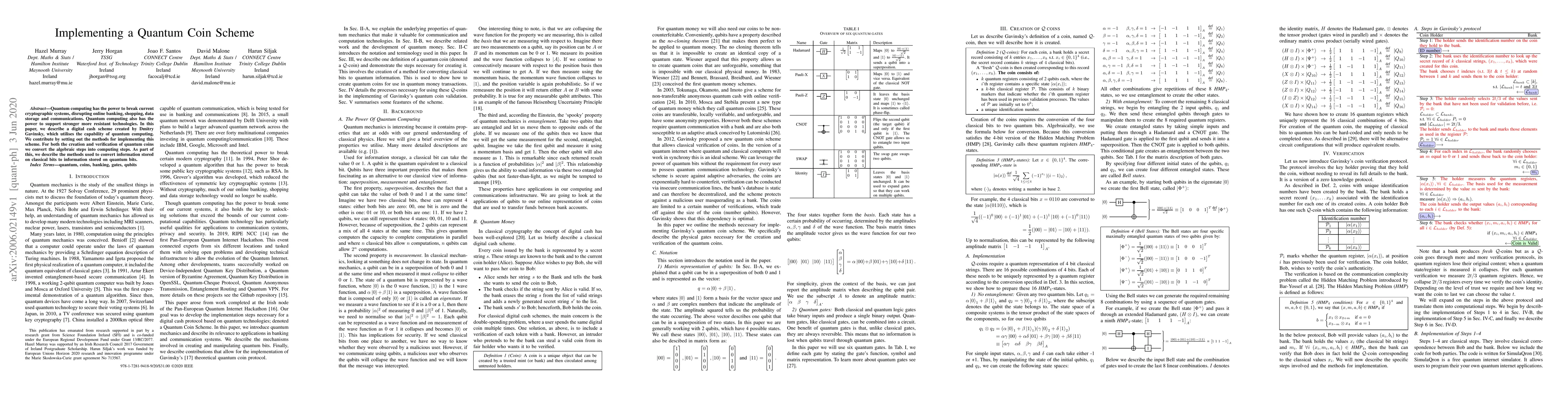 Quantum computing has the power to break current cryptographic systems, disrupting online banking, shopping, data storage and communications. Quantum computing also has the power to support stronger more resistant technologies. In this paper, we describe a digital cash scheme created by Dmitry Gavinsky, which utilises the capability of quantum computing. We contribute by setting out the methods for implementing this scheme. For both the creation and verification of quantum coins we convert the algebraic steps into computing steps. As part of this, we describe the methods used to convert information stored on classical bits to information stored on quantum bits.