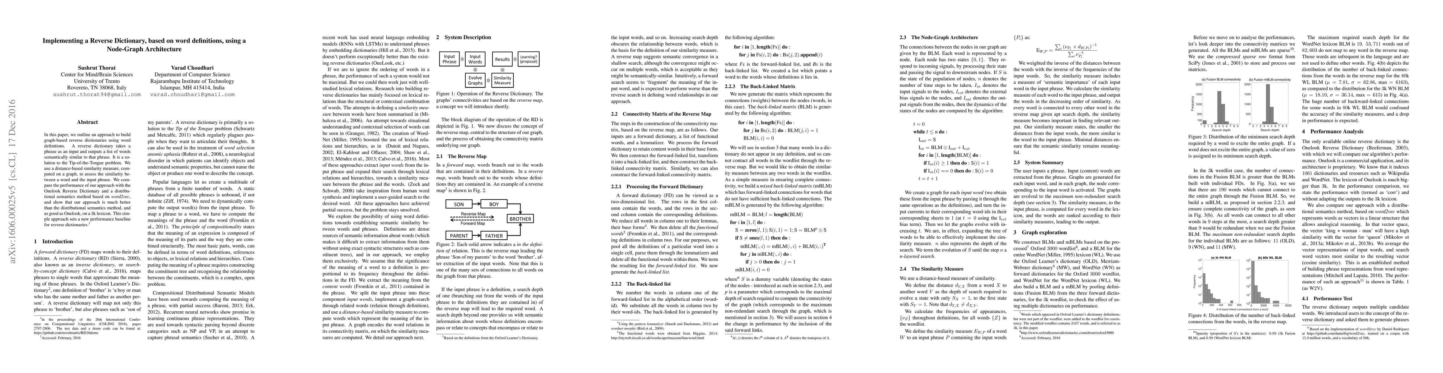 This paper proposes a graph-based reverse dictionary using word definitions to address the Tip-of-the-Tongue problem, achieving better performance than a word2vec-based method and comparable results to Onelook Reverse Dictionary on a 3k lexicon. The approach uses a distance-based similarity measure on a node-graph architecture.