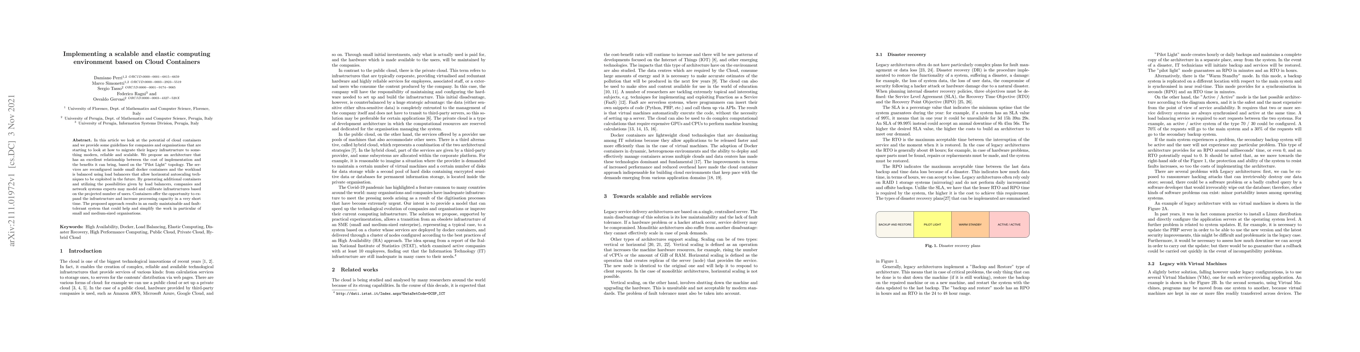 In this article we look at the potential of cloud containers and we provide some guidelines for companies and organisations that are starting to look at how to migrate their legacy infrastructure to something modern, reliable and scalable. We propose an architecture that has an excellent relationship between the cost of implementation and the benefits it can bring, based on the "Pilot Light" topology. The services are reconfigured inside small docker containers and the workload is balanced using load balancers that allow horizontal autoscaling techniques to be exploited in the future. By generating additional containers and utilizing the possibilities given by load balancers, companies and network systems experts may model and calibrate infrastructures based on the projected number of users. Containers offer the opportunity to expand the infrastructure and increase processing capacity in a very short time. The proposed approach results in an easily maintainable and fault-tolerant system that could help and simplify the work in particular of small and medium-sized organisations.