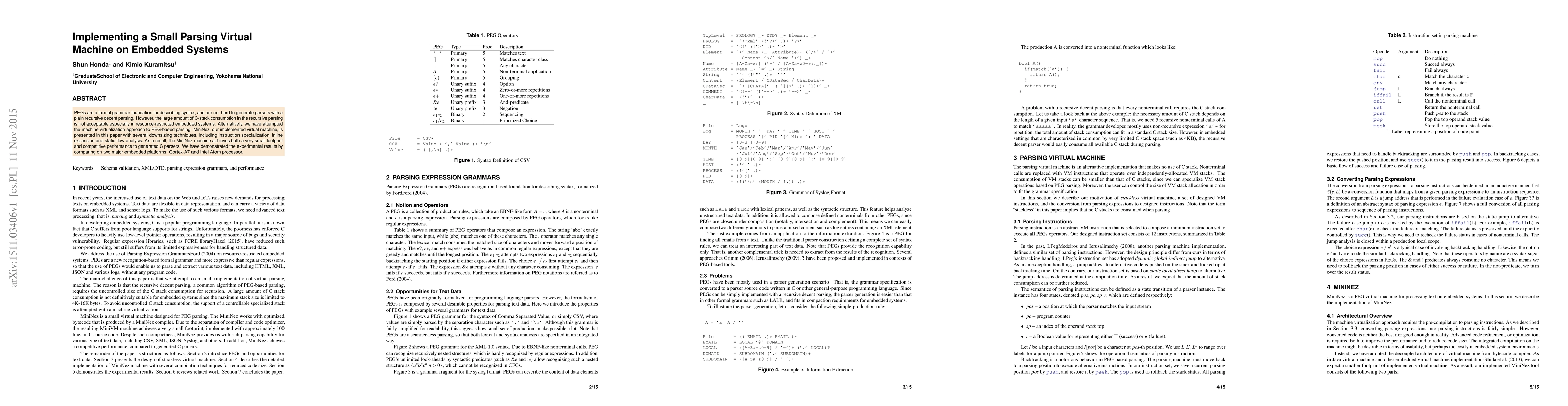 PEGs are a formal grammar foundation for describing syntax, and are not hard to generate parsers with a plain recursive decent parsing. However, the large amount of C-stack consumption in the recursive parsing is not acceptable especially in resource-restricted embedded systems. Alternatively, we have attempted the machine virtualization approach to PEG-based parsing. MiniNez, our implemented virtual machine, is presented in this paper with several downsizing techniques, including instruction specialization, inline expansion and static flow analysis. As a result, the MiniNez machine achieves both a very small footprint and competitive performance to generated C parsers. We have demonstrated the experimental results by comparing on two major embedded platforms: Cortex-A7 and Intel Atom processor.