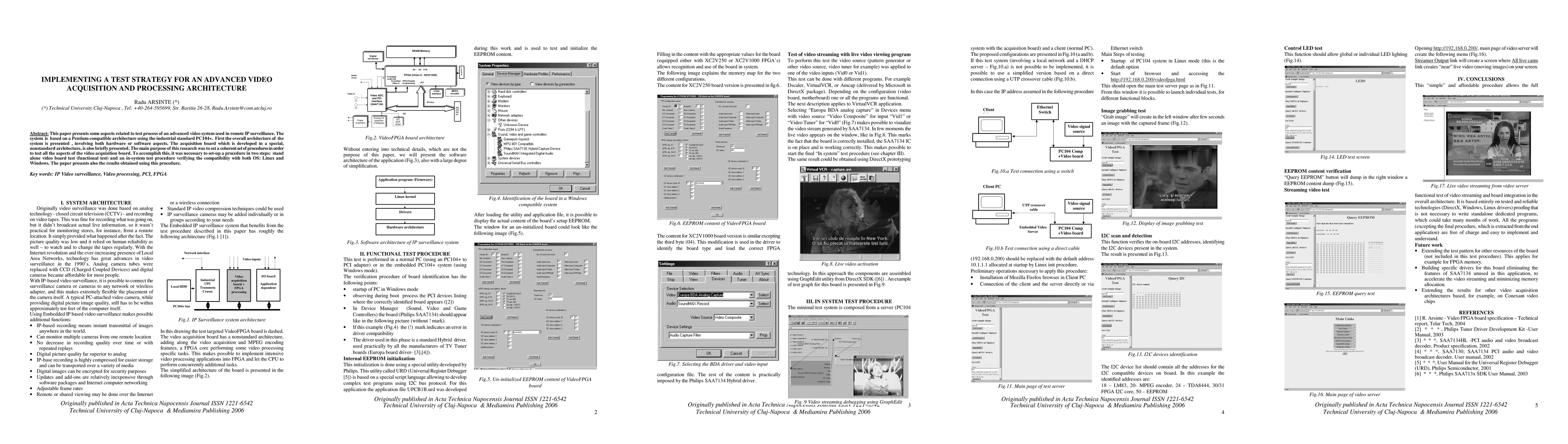 This paper outlines a test strategy for an advanced video acquisition system in remote IP surveillance, detailing a two-step procedure for functional and in-system testing to ensure compatibility with Linux and Windows. Results from the implemented test procedures are also discussed.