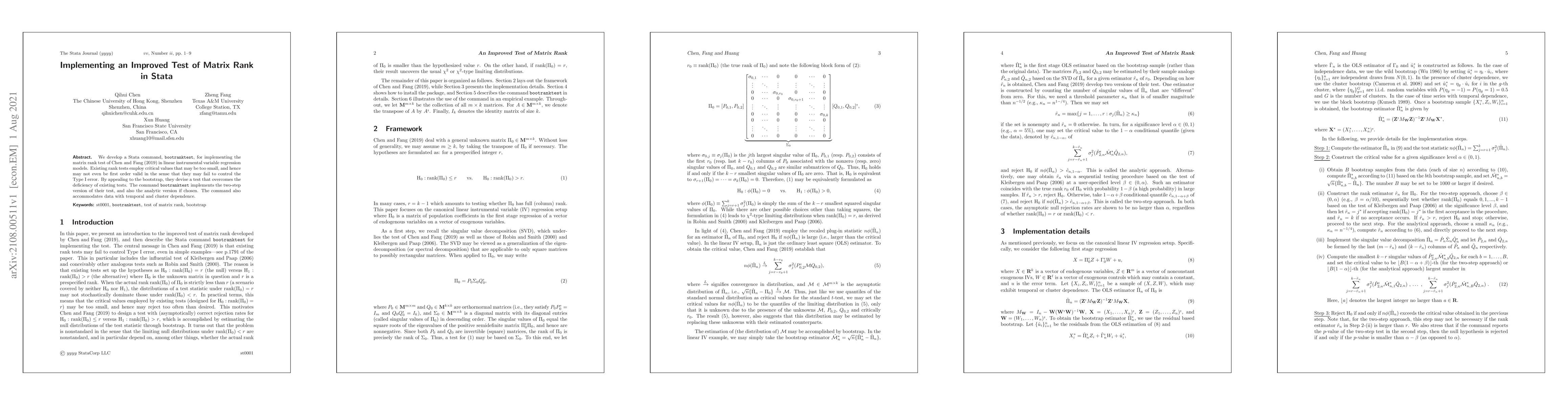 The paper introduces a new Stata command, bootranktest, to implement an improved matrix rank test for linear instrumental variable regression models, addressing the issue of overly conservative existing tests by using bootstrapping for more accurate critical values. The command supports both two-step and analytic versions of the test and can handle data with temporal and cluster dependence.