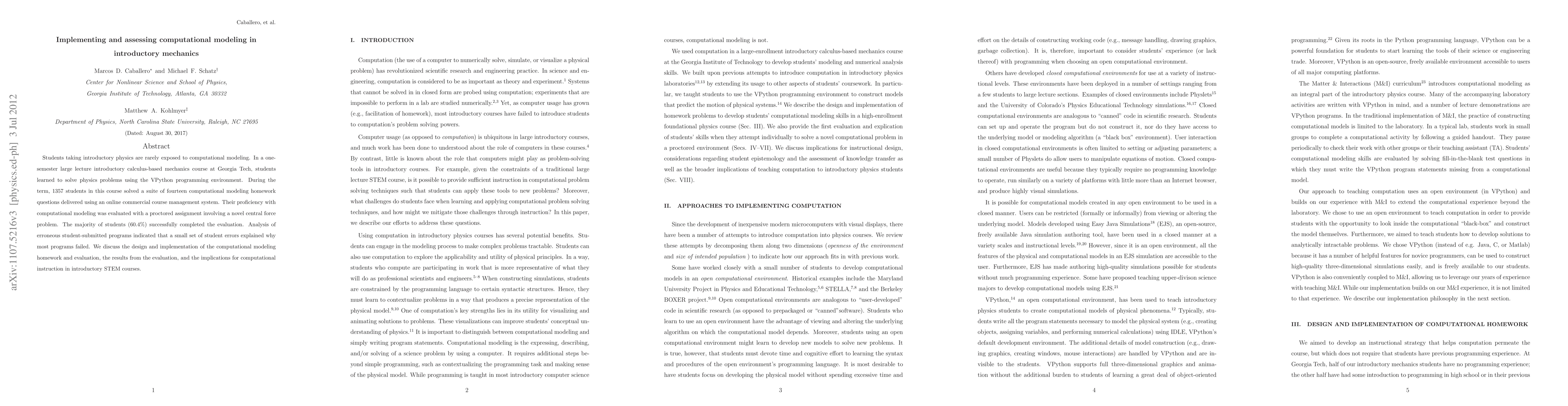 Students taking introductory physics are rarely exposed to computational modeling. In a one-semester large lecture introductory calculus-based mechanics course at Georgia Tech, students learned to solve physics problems using the VPython programming environment. During the term 1357 students in this course solved a suite of fourteen computational modeling homework questions delivered using an online commercial course management system. Their proficiency with computational modeling was evaluated in a proctored environment using a novel central force problem. The majority of students (60.4%) successfully completed the evaluation. Analysis of erroneous student-submitted programs indicated that a small set of student errors explained why most programs failed. We discuss the design and implementation of the computational modeling homework and evaluation, the results from the evaluation and the implications for instruction in computational modeling in introductory STEM courses.
