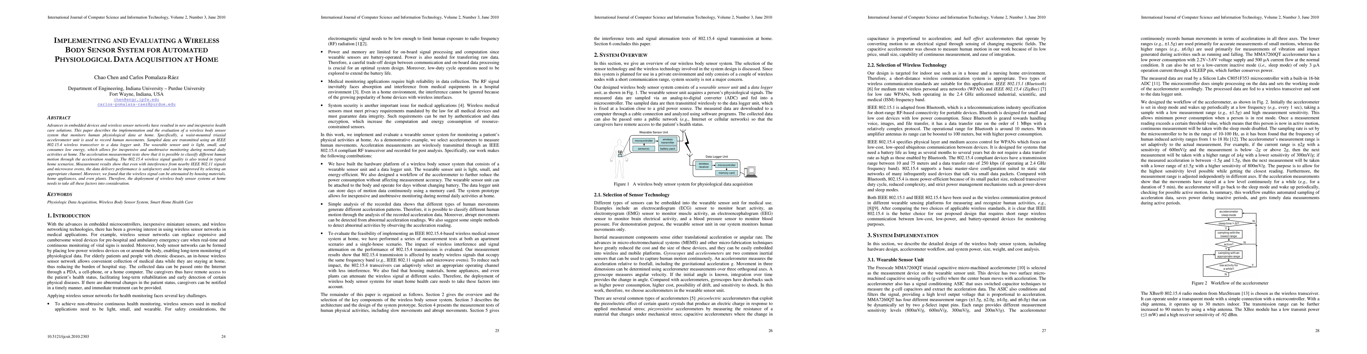 A wireless body sensor system was implemented and evaluated for monitoring human physiological data at home, with results showing satisfactory signal quality despite interference from nearby devices.