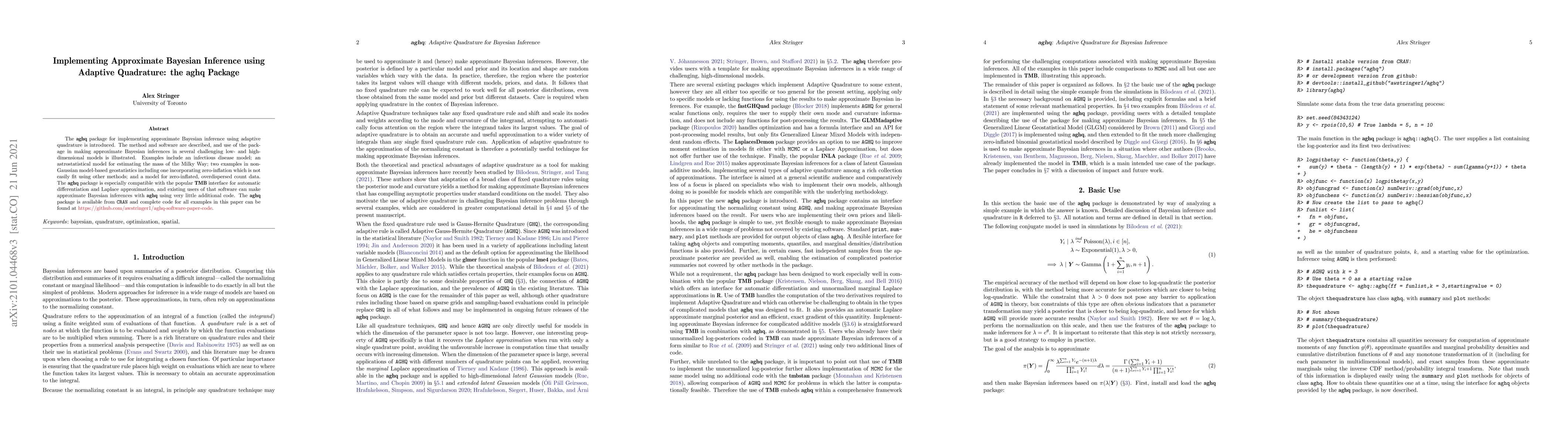The aghq package facilitates approximate Bayesian inference using adaptive quadrature, demonstrated through various challenging models including infectious disease, astrostatistics, geostatistics, and count data. It integrates seamlessly with the TMB interface, requiring minimal additional code for existing users.