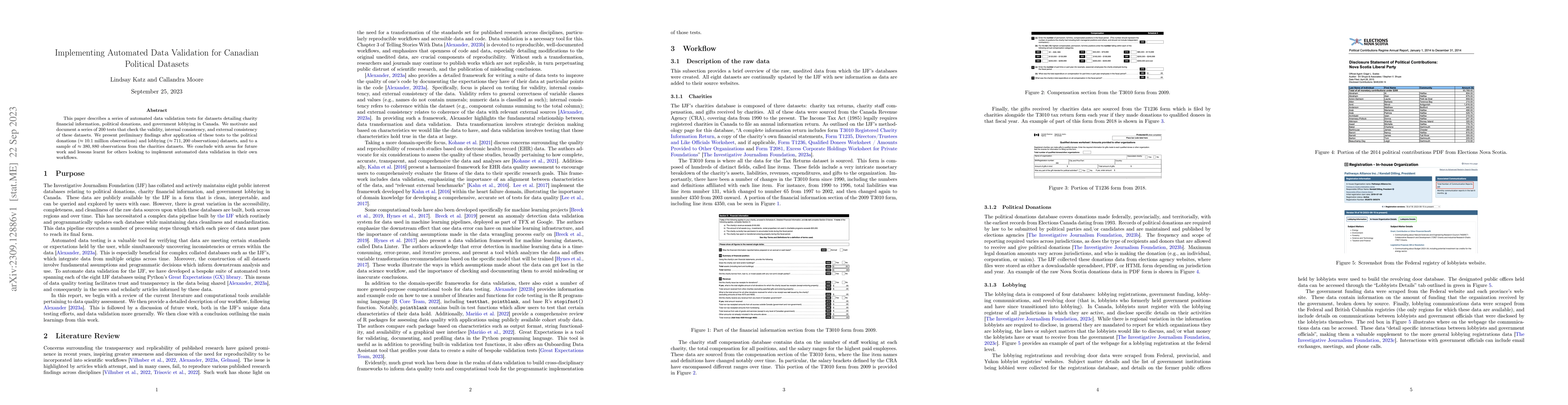 This paper describes a series of automated data validation tests for datasets detailing charity financial information, political donations, and government lobbying in Canada. We motivate and document a series of 200 tests that check the validity, internal consistency, and external consistency of these datasets. We present preliminary findings after application of these tests to the political donations ($\approx10.1$ million observations) and lobbying ($\approx711,200$ observations) datasets, and to a sample of $\approx380,880$ observations from the charities datasets. We conclude with areas for future work and lessons learnt for others looking to implement automated data validation in their own workflows.