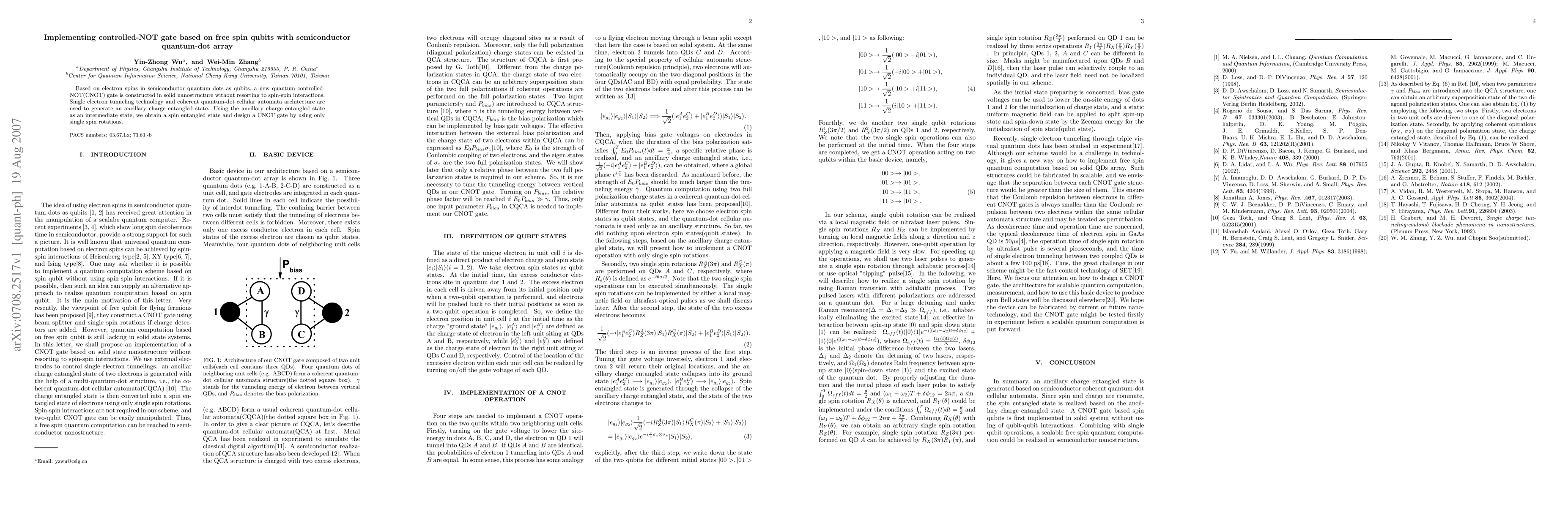 This paper proposes a novel implementation of a quantum controlled-NOT (CNOT) gate using free spin qubits in a semiconductor quantum-dot array, relying on single electron tunneling and coherent quantum-dot cellular automata without spin-spin interactions. The CNOT gate is achieved through single spin rotations facilitated by an ancillary charge entangled state.