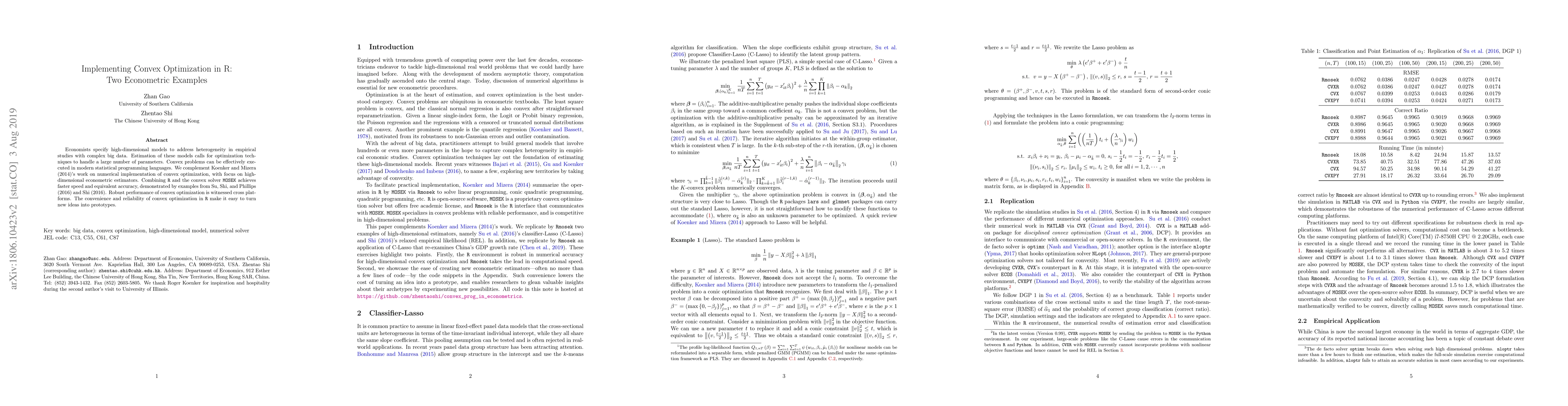 Economists specify high-dimensional models to address heterogeneity in empirical studies with complex big data. Estimation of these models calls for optimization techniques to handle a large number of parameters. Convex problems can be effectively executed in modern statistical programming languages. We complement Koenker and Mizera (2014)'s work on numerical implementation of convex optimization, with focus on high-dimensional econometric estimators. Combining R and the convex solver MOSEK achieves faster speed and equivalent accuracy, demonstrated by examples from Su, Shi, and Phillips (2016) and Shi (2016). Robust performance of convex optimization is witnessed cross platforms. The convenience and reliability of convex optimization in R make it easy to turn new ideas into prototypes.