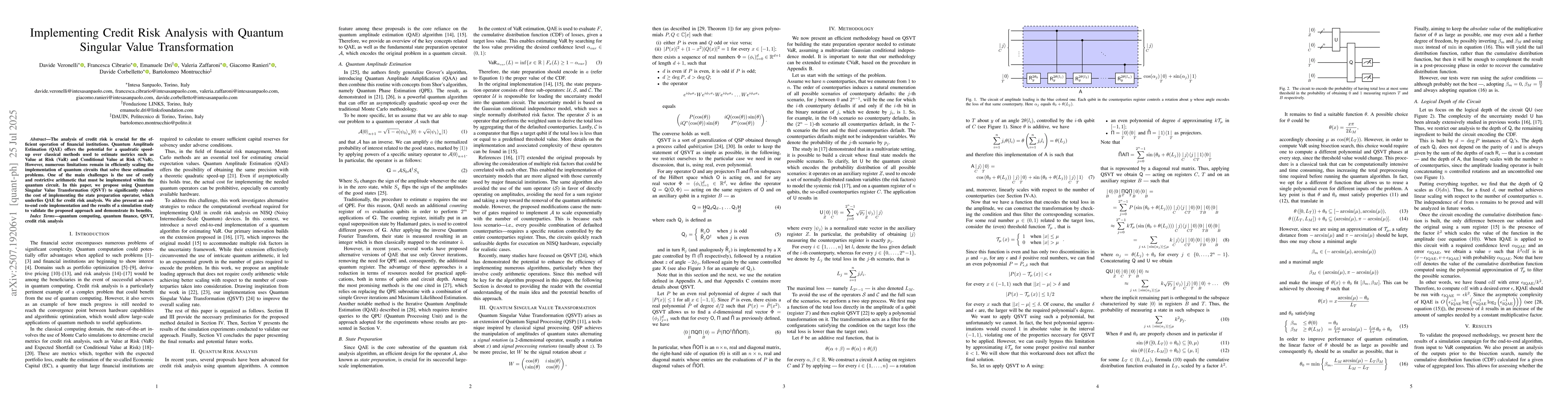 The analysis of credit risk is crucial for the efficient operation of financial institutions. Quantum Amplitude Estimation (QAE) offers the potential for a quadratic speed-up over classical methods used to estimate metrics such as Value at Risk (VaR) and Conditional Value at Risk (CVaR). However, numerous limitations remain in efficiently scaling the implementation of quantum circuits that solve these estimation problems. One of the main challenges is the use of costly and restrictive arithmetic that must be implemented within the quantum circuit. In this paper, we propose using Quantum Singular Value Transformation (QSVT) to significantly reduce the cost of implementing the state preparation operator, which underlies QAE for credit risk analysis. We also present an end-to-end code implementation and the results of a simulation study to validate the proposed approach and demonstrate its benefits.