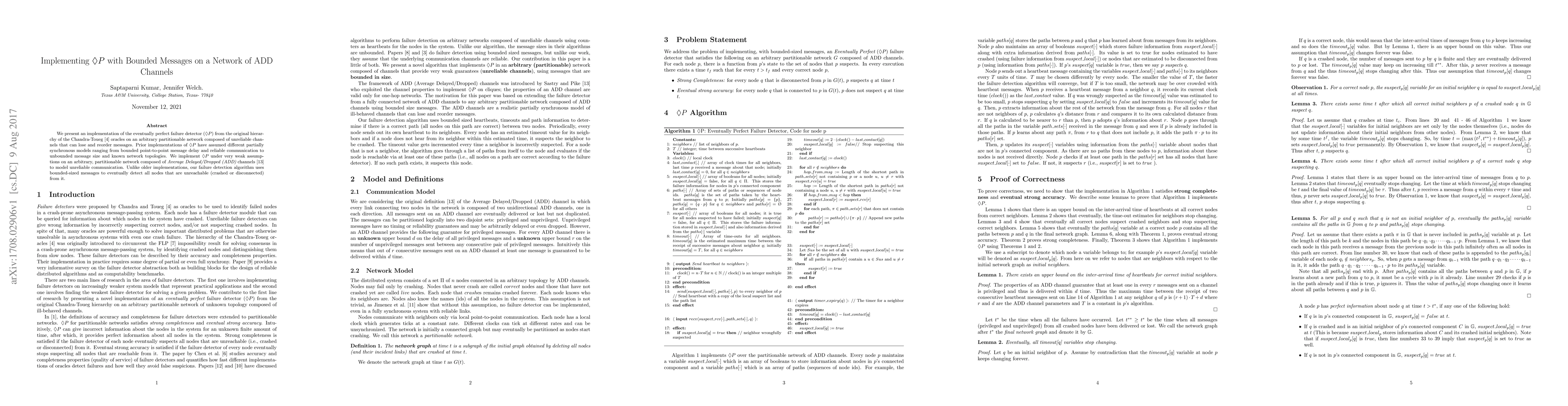 We present an implementation of the eventually perfect failure detector ($\Diamond P$) from the original hierarchy of the Chandra-Toueg oracles on an arbitrary partitionable network composed of unreliable channels that can lose and reorder messages. Prior implementations of $\Diamond P$ have assumed different partially synchronous models ranging from bounded point-to-point message delay and reliable communication to unbounded message size and known network topologies. We implement $\Diamond P$ under very weak assumptions on an arbitrary, partitionable network composed of Average Delayed/Dropped (ADD) channels to model unreliable communication. Unlike older implementations, our failure detection algorithm uses bounded-sized messages to eventually detect all nodes that are unreachable (crashed or disconnected) from it.