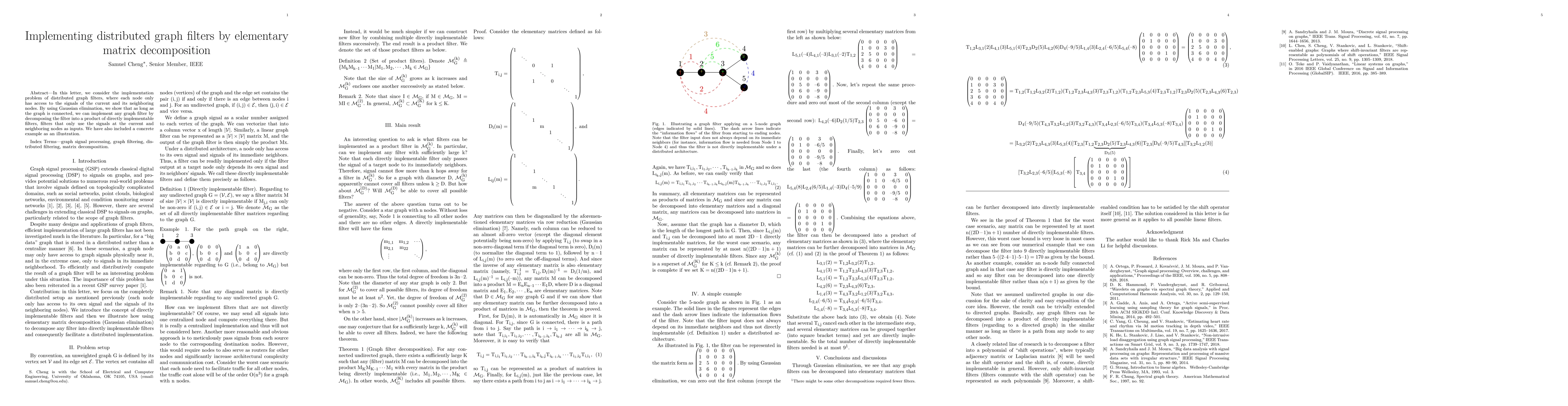 This paper proposes a method for implementing distributed graph filters using Gaussian elimination and elementary matrix decomposition, ensuring that any filter can be constructed from directly implementable filters accessible to each node based on local and neighboring signals, provided the graph is connected. A concrete example is provided to illustrate the approach.