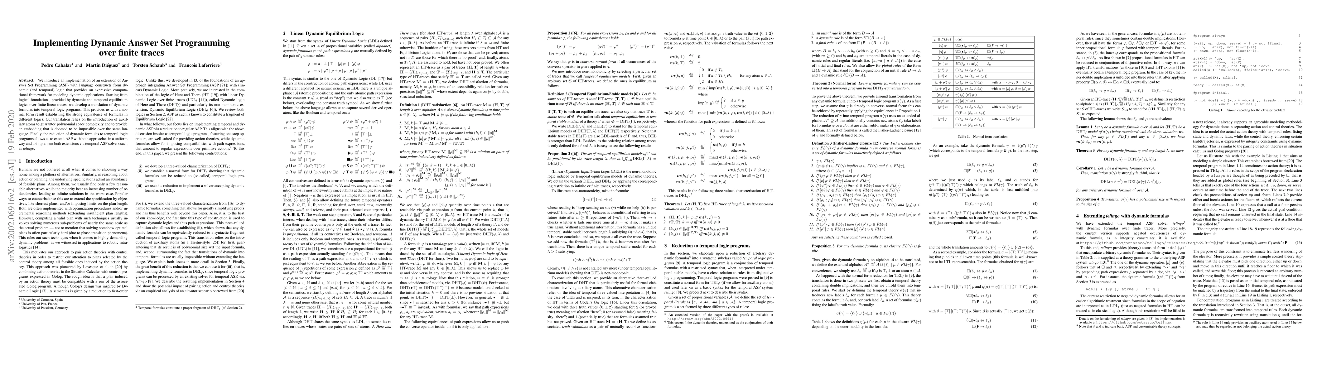 This paper presents an implementation of an extended Answer Set Programming (ASP) framework incorporating dynamic and temporal logic constructs, enabling the modeling of dynamic applications. The authors achieve strong equivalence between dynamic and temporal logics through a translation of dynamic formulas into temporal logic programs, utilizing auxiliary atoms to maintain polynomial space complexity.
