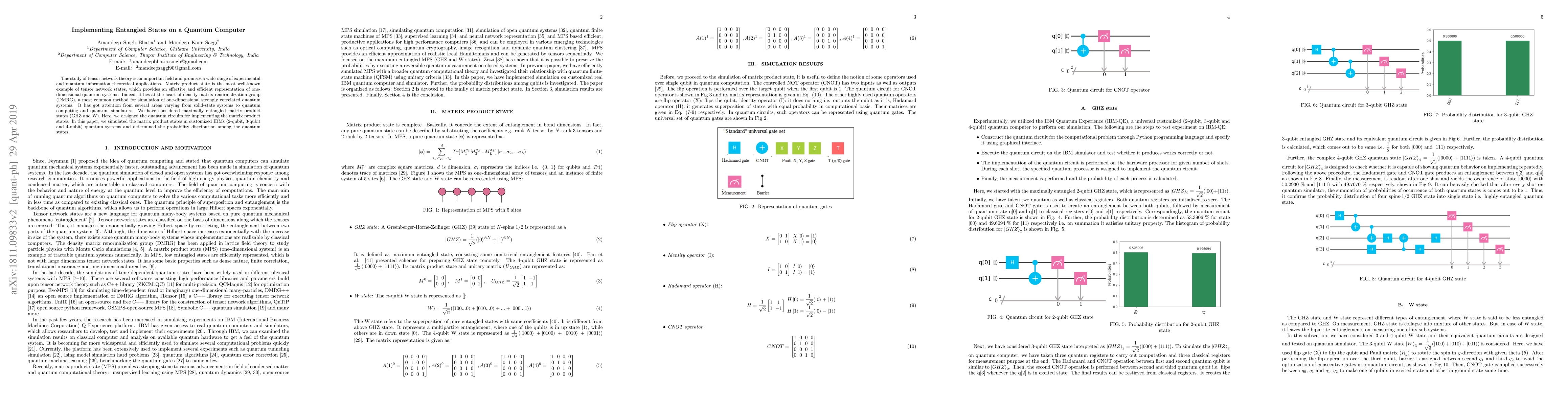 This paper presents the design and simulation of quantum circuits for maximally entangled matrix product states (GHZ and W) using IBM's 2-qubit, 3-qubit, and 4-qubit quantum systems. The research determines probability distributions among quantum states, contributing to the development of quantum computing and simulators.