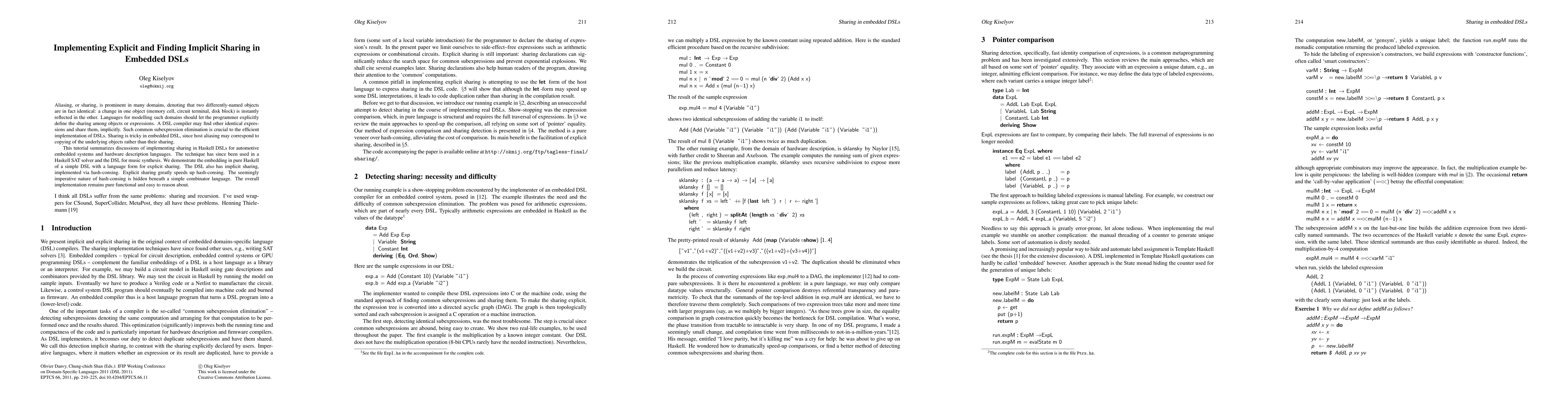 This paper discusses implementing explicit and implicit sharing in embedded domain-specific languages (DSLs) using Haskell, focusing on efficient modeling of aliasing in automotive systems and hardware descriptions. It demonstrates a pure functional approach to embedding a DSL with explicit sharing and implicit sharing via hash-consing, maintaining simplicity and efficiency.