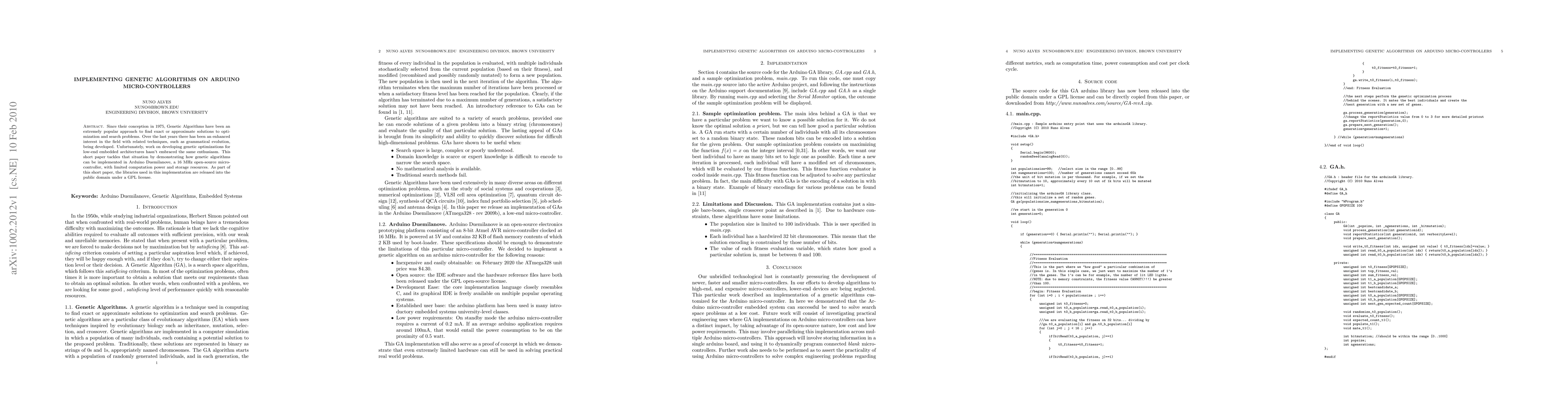 This paper demonstrates the implementation of genetic algorithms on Arduino Duemilanove micro-controllers, addressing the lack of such optimizations for low-end embedded systems. The authors release the libraries used under a GPL license to encourage further development.