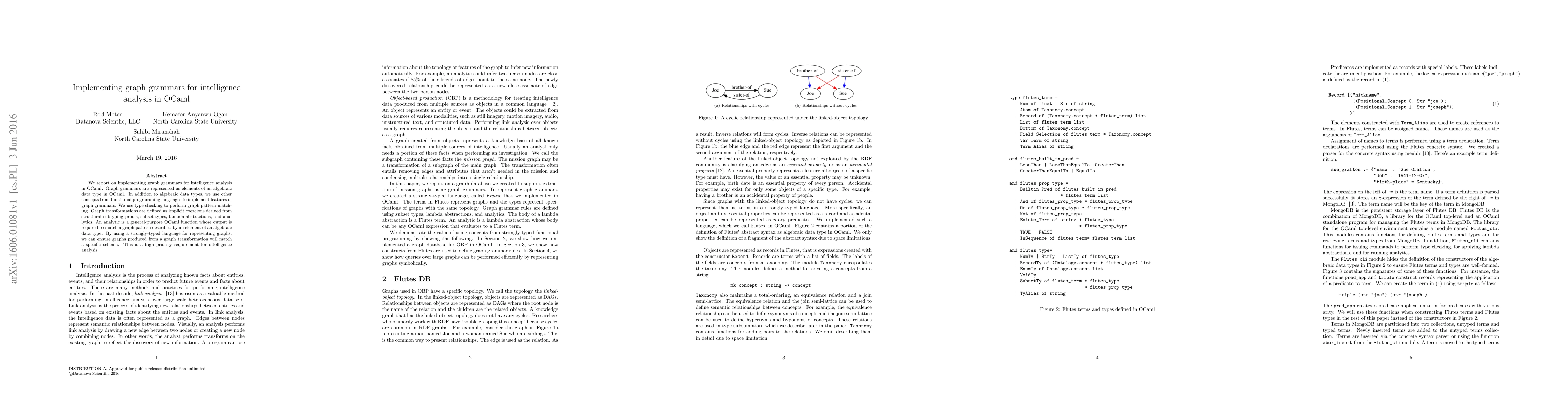 This paper details the implementation of graph grammars in OCaml for intelligence analysis, utilizing algebraic data types and functional programming concepts for pattern matching and graph transformations. The use of type checking ensures that transformed graphs adhere to a predefined schema, crucial for intelligence analysis.