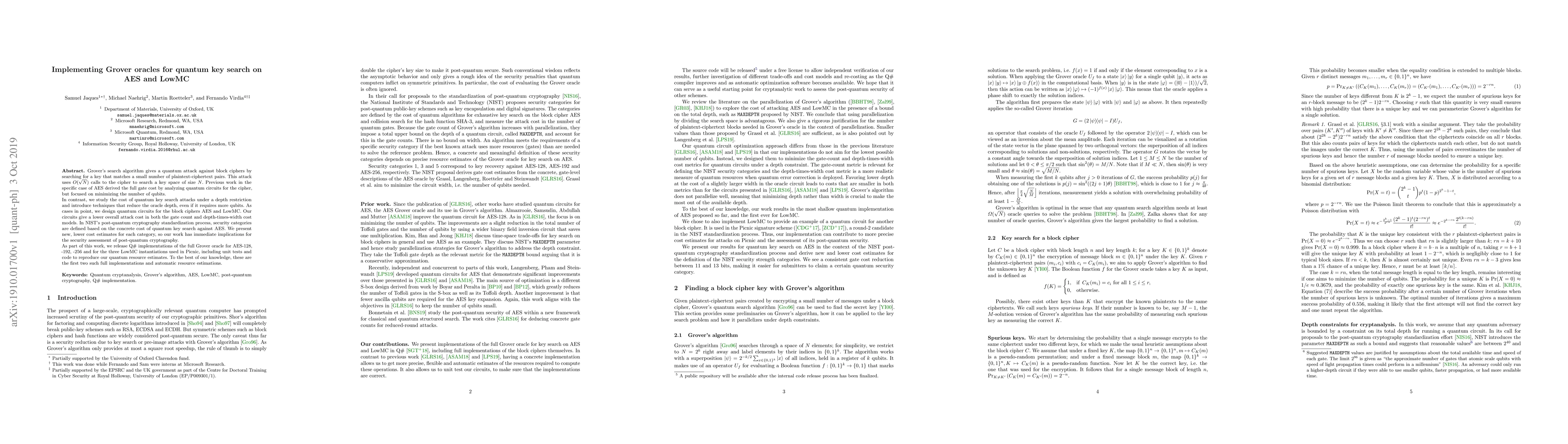 Grover's search algorithm gives a quantum attack against block ciphers by searching for a key that matches a small number of plaintext-ciphertext pairs. This attack uses $O(\sqrt{N})$ calls to the cipher to search a key space of size $N$. Previous work in the specific case of AES derived the full gate cost by analyzing quantum circuits for the cipher, but focused on minimizing the number of qubits. In contrast, we study the cost of quantum key search attacks under a depth restriction and introduce techniques that reduce the oracle depth, even if it requires more qubits. As cases in point, we design quantum circuits for the block ciphers AES and LowMC. Our circuits give a lower overall attack cost in both the gate count and depth-times-width cost models. In NIST's post-quantum cryptography standardization process, security categories are defined based on the concrete cost of quantum key search against AES. We present new, lower cost estimates for each category, so our work has immediate implications for the security assessment of post-quantum cryptography. As part of this work, we release Q# implementations of the full Grover oracle for AES-128, -192, -256 and for the three LowMC instantiations used in Picnic, including unit tests and code to reproduce our quantum resource estimates. To the best of our knowledge, these are the first two such full implementations and automatic resource estimations.