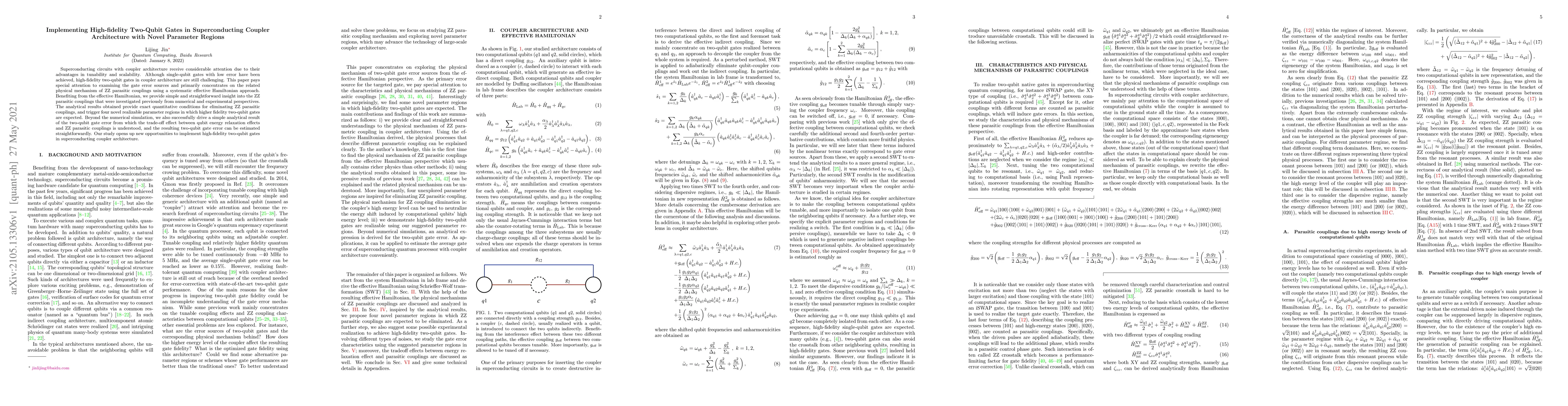 This paper investigates high-fidelity two-qubit gates in superconducting coupler architecture, focusing on ZZ parasitic coupling errors. It identifies novel parameter regions through an effective Hamiltonian approach, providing analytical conditions for minimizing these errors and estimating gate fidelity.