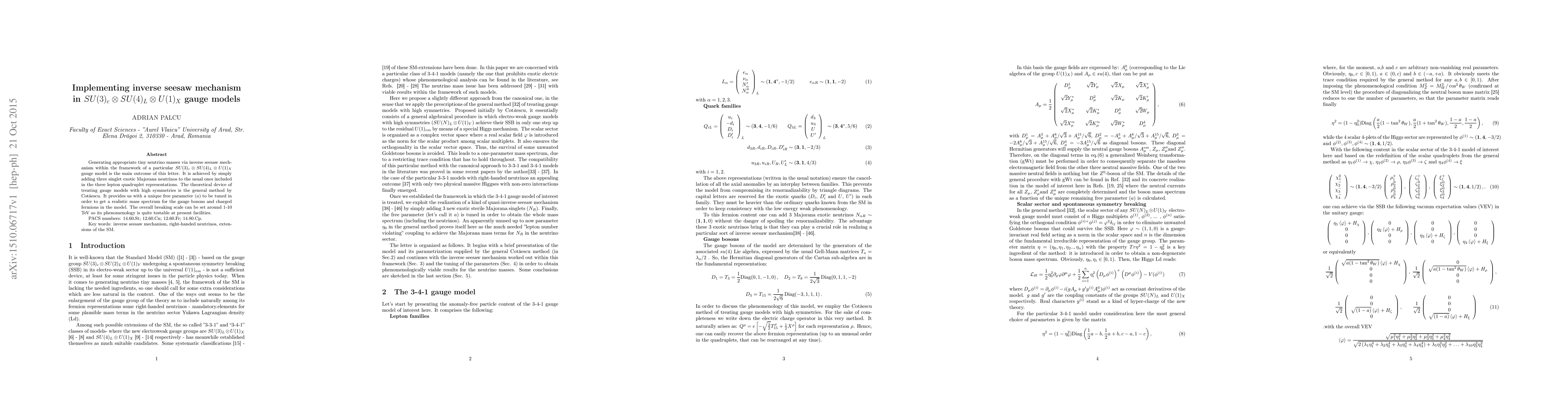 Generating appropriate tiny neutrino masses via inverse seesaw mechanism within the framework of a particular SU(3)xSU(4)xU(1) gauge model is the main outcome of this letter. It is achieved by simply adding three singlet exotic Majorana neutrinos to the usual ones included in the three lepton quadruplet representations. The theoretical device of treating gauge models with high symmetries is the general method by Cotaescu. It provides us with a unique free parameter (a) to be tuned in order to get a realistic mass spectrum for the gauge bosons and charged fermions in the model. The overall breaking scale can be set around 1-10 TeV so its phenomenology is quite testable at present facilities.