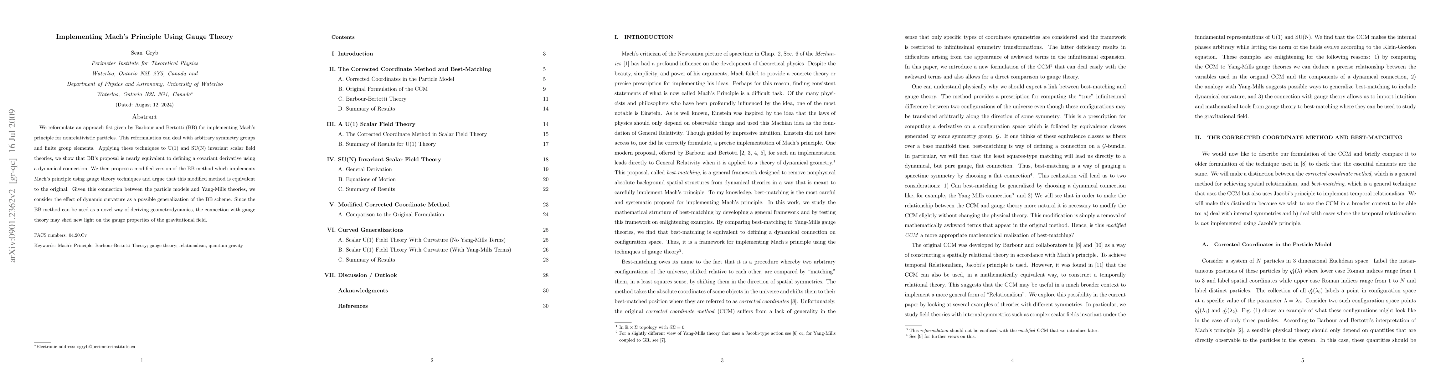 We reformulate an approach fist given by Barbour and Bertotti (BB) for implementing Mach's principle for nonrelativistic particles. This reformulation can deal with arbitrary symmetry groups and finite group elements. Applying these techniques to U(1) and SU(N) invariant scalar field theories, we show that BB's proposal is nearly equivalent to defining a covariant derivative using a dynamical connection. We then propose a modified version of the BB method which implements Mach's principle using gauge theory techniques and argue that this modified method is equivalent to the original. Given this connection between the particle models and Yang-Mills theories, we consider the effect of dynamic curvature as a possible generalization of the BB scheme. Since the BB method can be used as a novel way of deriving geometrodynamics, the connection with gauge theory may shed new light on the gauge properties of the gravitational field.