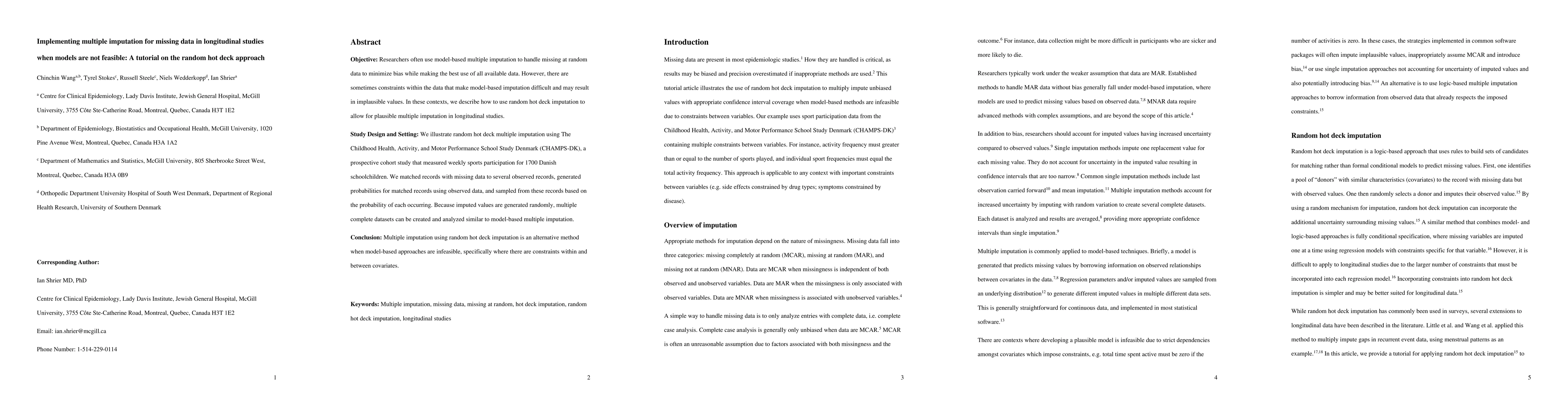 This paper presents a tutorial on using random hot deck imputation for handling missing data in longitudinal studies when model-based methods are impractical. It demonstrates the method using data from the CHAMPS-DK study, showing how plausible imputations can be generated through random matching and probability-based sampling.