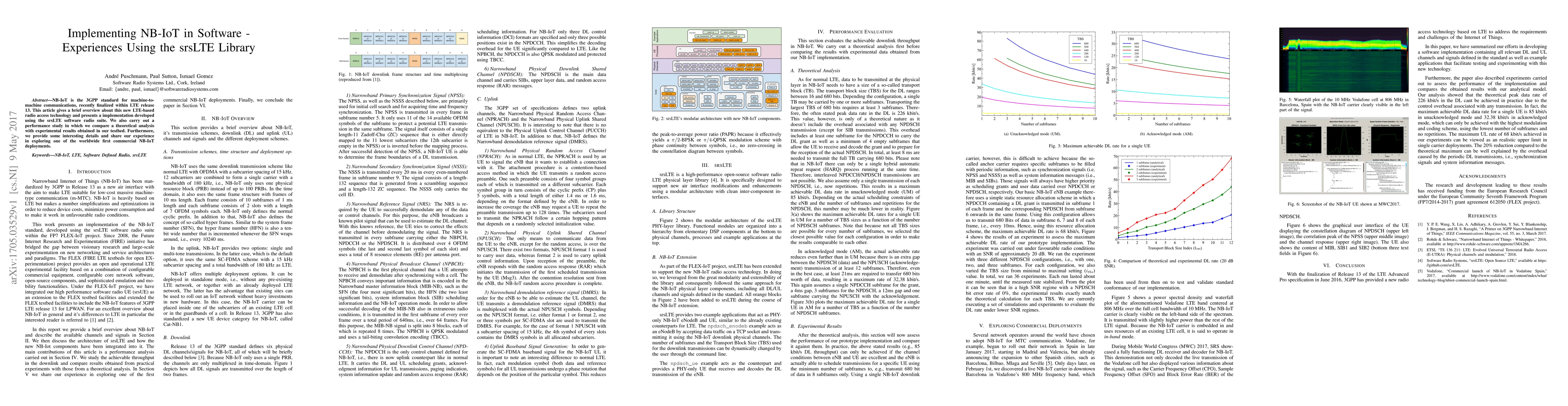 This paper explores the implementation of NB-IoT using the srsLTE software radio suite and compares theoretical analysis with experimental results, sharing insights from one of the first commercial NB-IoT deployments. The study highlights performance and practical experiences in deploying this new LTE-based technology.