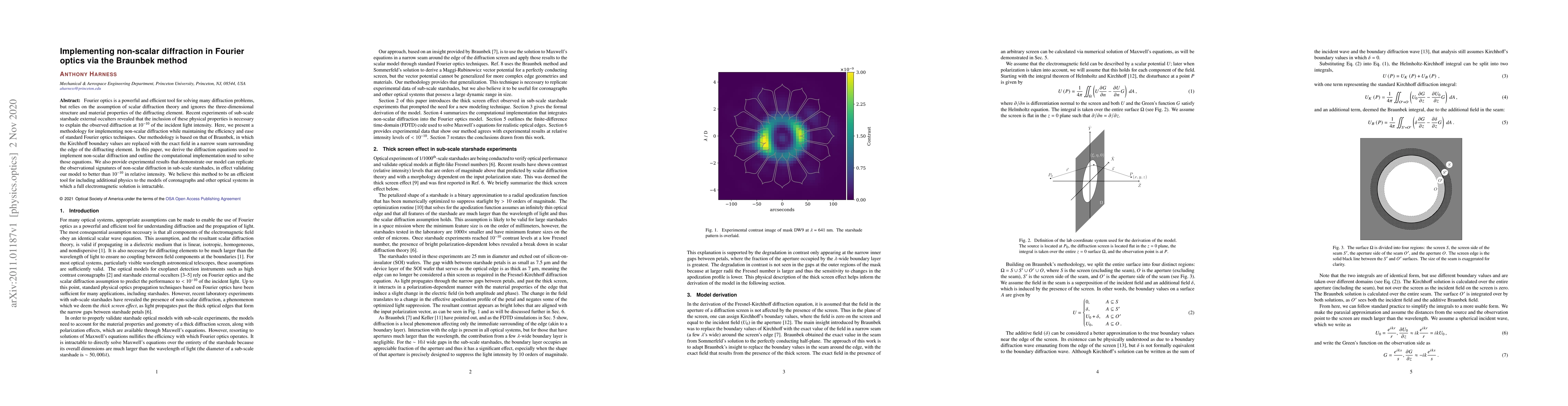 Fourier optics is a powerful and efficient tool for solving many diffraction problems, but relies on the assumption of scalar diffraction theory and ignores the three-dimensional structure and material properties of the diffracting element. Recent experiments of sub-scale starshade external occulters revealed that the inclusion of these physical properties is necessary to explain the observed diffraction at 1e-10 of the incident light intensity. Here, we present a methodology for implementing non-scalar diffraction while maintaining the efficiency and ease of standard Fourier optics techniques. Our methodology is based on that of Braunbek, in which the Kirchhoff boundary values are replaced with the exact field in a narrow seam surrounding the edge of the diffracting element. In this paper, we derive the diffraction equations used to implement non-scalar diffraction and outline the computational implementation used to solve those equations. We also provide experimental results that demonstrate our model can replicate the observational signatures of non-scalar diffraction in sub-scale starshades, in effect validating our model to better than 1e-10 in relative intensity. We believe this method to be an efficient tool for including additional physics to the models of coronagraphs and other optical systems in which a full electromagnetic solution is intractable.