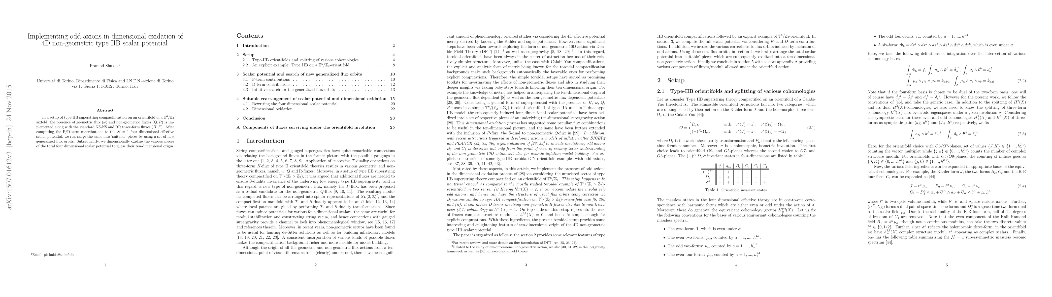 In a setup of type IIB superstring compactification on an orientifold of a ${\mathbb T}^6/{\mathbb Z}_4$ sixfold, the presence of geometric flux ($\omega$) and non-geometric fluxes ($Q, R$) is implemented along with the standard NS-NS and RR three-form fluxes ($H, F$). After computing the F/D-term contributions to the ${\cal N}=1$ four dimensional effective scalar potential, we rearrange the same into `suitable' pieces by using a set of new generalized flux orbits. Subsequently, we dimensionally oxidize the various pieces of the total four dimensional scalar potential to guess their ten-dimensional origin.