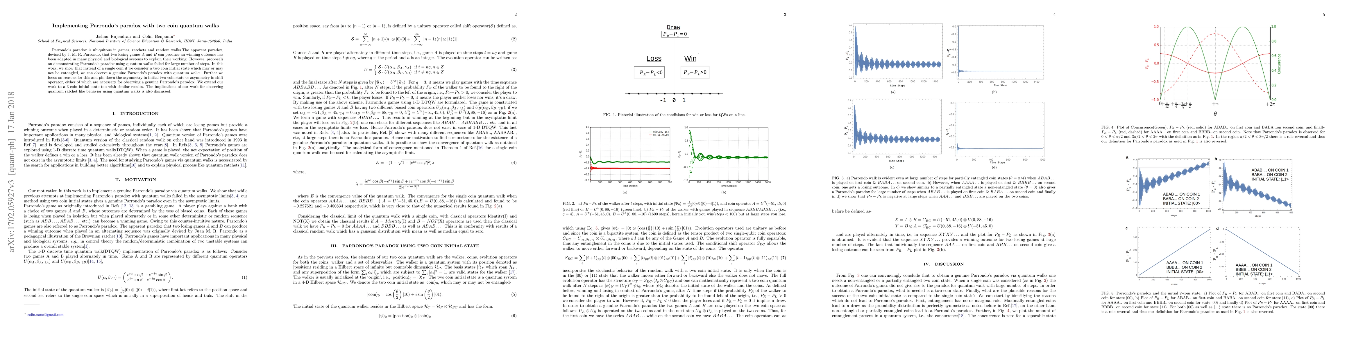 This paper demonstrates Parrondo's paradox in quantum walks using a two-coin initial state, showing that asymmetry in the initial state or shift operator is necessary for a winning outcome. The study extends to a three-coin state, highlighting implications for quantum ratchet behavior.