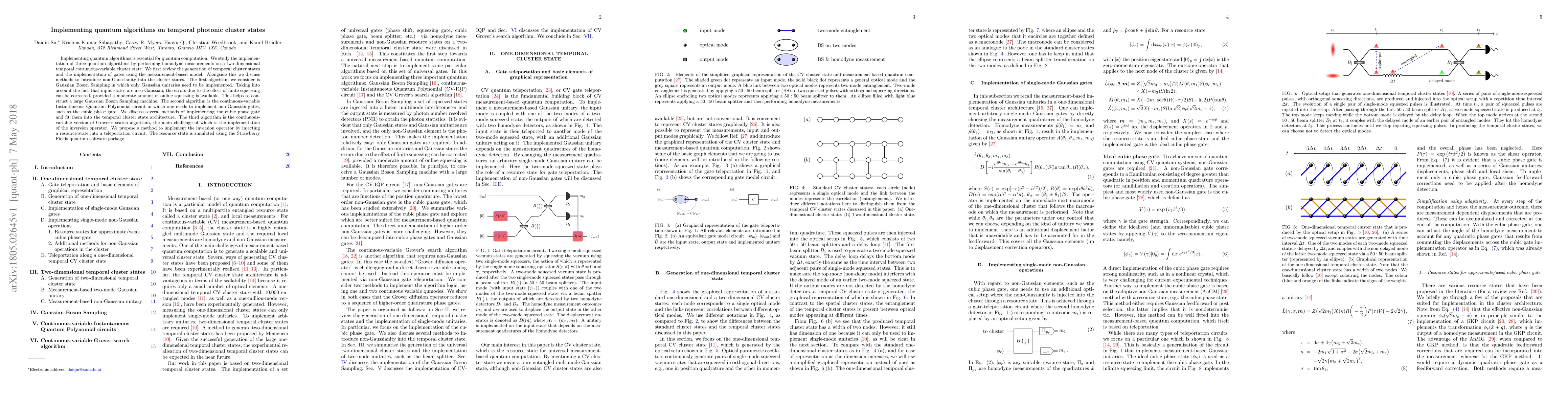 Implementing quantum algorithms is essential for quantum computation. We study the implementation of three quantum algorithms by performing homodyne measurements on a two-dimensional temporal continuous-variable cluster state. We first review the generation of temporal cluster states and the implementation of gates using the measurement-based model. Alongside this we discuss methods to introduce non-Gaussianity into the cluster states. The first algorithm we consider is Gaussian Boson Sampling in which only Gaussian unitaries need to be implemented. Taking into account the fact that input states are also Gaussian, the errors due to the effect of finite squeezing can be corrected, provided a moderate amount of online squeezing is available. This helps to construct a large Gaussian Boson Sampling machine. The second algorithm is the continuous-variable Instantaneous Quantum Polynomial circuit in which one needs to implement non-Gaussian gates, such as the cubic phase gate. We discuss several methods of implementing the cubic phase gate and fit them into the temporal cluster state architecture. The third algorithm is the continuous-variable version of Grover's search algorithm, the main challenge of which is the implementation of the inversion operator. We propose a method to implement the inversion operator by injecting a resource state into a teleportation circuit. The resource state is simulated using the Strawberry Fields quantum software package.