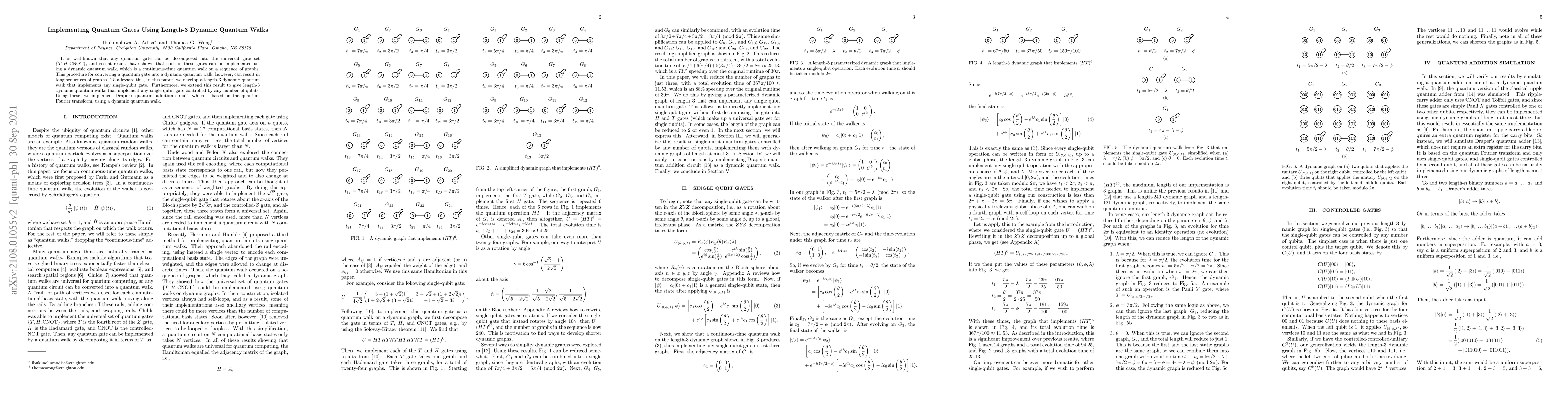 It is well-known that any quantum gate can be decomposed into the universal gate set {T, H, CNOT}, and recent results have shown that each of these gates can be implemented using a dynamic quantum walk, which is a continuous-time quantum walk on a sequence of graphs. This procedure for converting a quantum gate into a dynamic quantum walk, however, can result in long sequences of graphs. To alleviate this, in this paper, we develop a length-3 dynamic quantum walk that implements any single-qubit gate. Furthermore, we extend this result to give length-3 dynamic quantum walks that implement any single-qubit gate controlled by any number of qubits. Using these, we implement Draper's quantum addition circuit, which is based on the quantum Fourier transform, using a dynamic quantum walk.